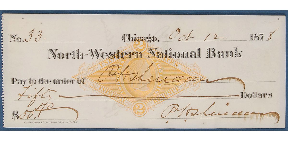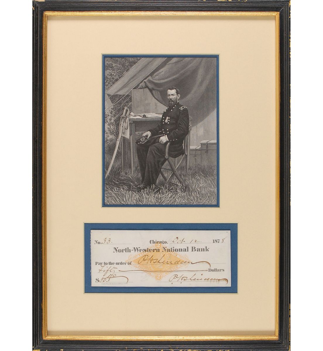 Desirable twice-signed bank check, 6.75 x 2.75, filled out and signed by Sheridan, “P. H. Sheridan,” payable to himself for $50, October 12, 1878. Nicely double-matted and framed with a full-length engraved portrait of the general in uniform to an overall size of 12.5 x 17. In fine condition, with insignificant cancellation cuts passing through the payee, slight show-through from docketing to reverse, and a bit of brushing to the end of one signature.
