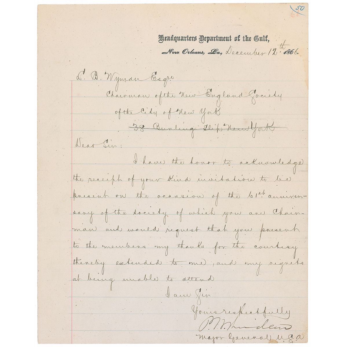 Union general (1831–1888) whose cavalry command blocked Lee’s escape at Appomattox. LS signed “P. H. Sheridan,” one page, lightly-lined, 7.75 x 9.75, Headquarters Department of the Gulf letterhead, December 12, 1866. Letter to C. B. Wyman of the New England Society. In part: “Of your kind invitation to be present on the occasion of the 61st anniversary of the society…my regrets at being unable to attend.” In fine condition, with a couple trivial edge separations at mailing folds and tiny stain to bottom edge.