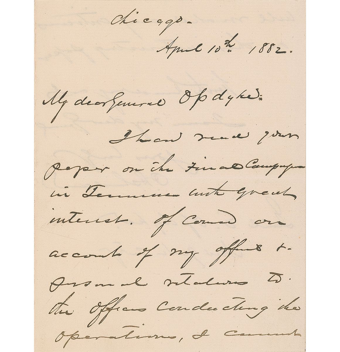 ALS signed “P. H. Sheridan,” one page both sides, 5 x 6.5, April 10, 1882. Letter to General Opdycke. In full: “I have read your paper on the Final Campaign in Tennessee with great interest. Of course on account of my official & personal relations to the offices conducting the operations, I cannot well make any criticisms on this interesting paper.” In fine condition, with the central horizontal mailing fold passing through the tops of a few letters in the signature.