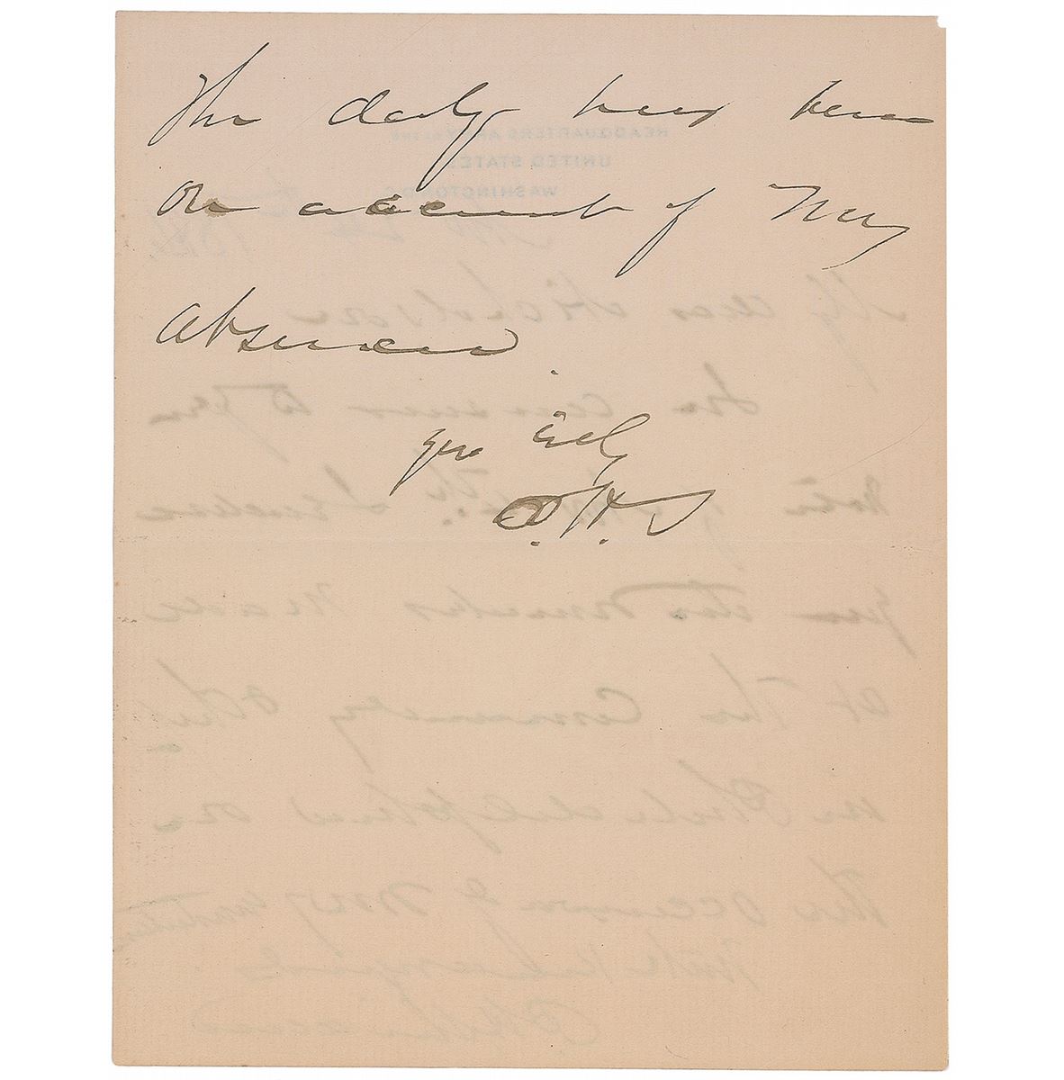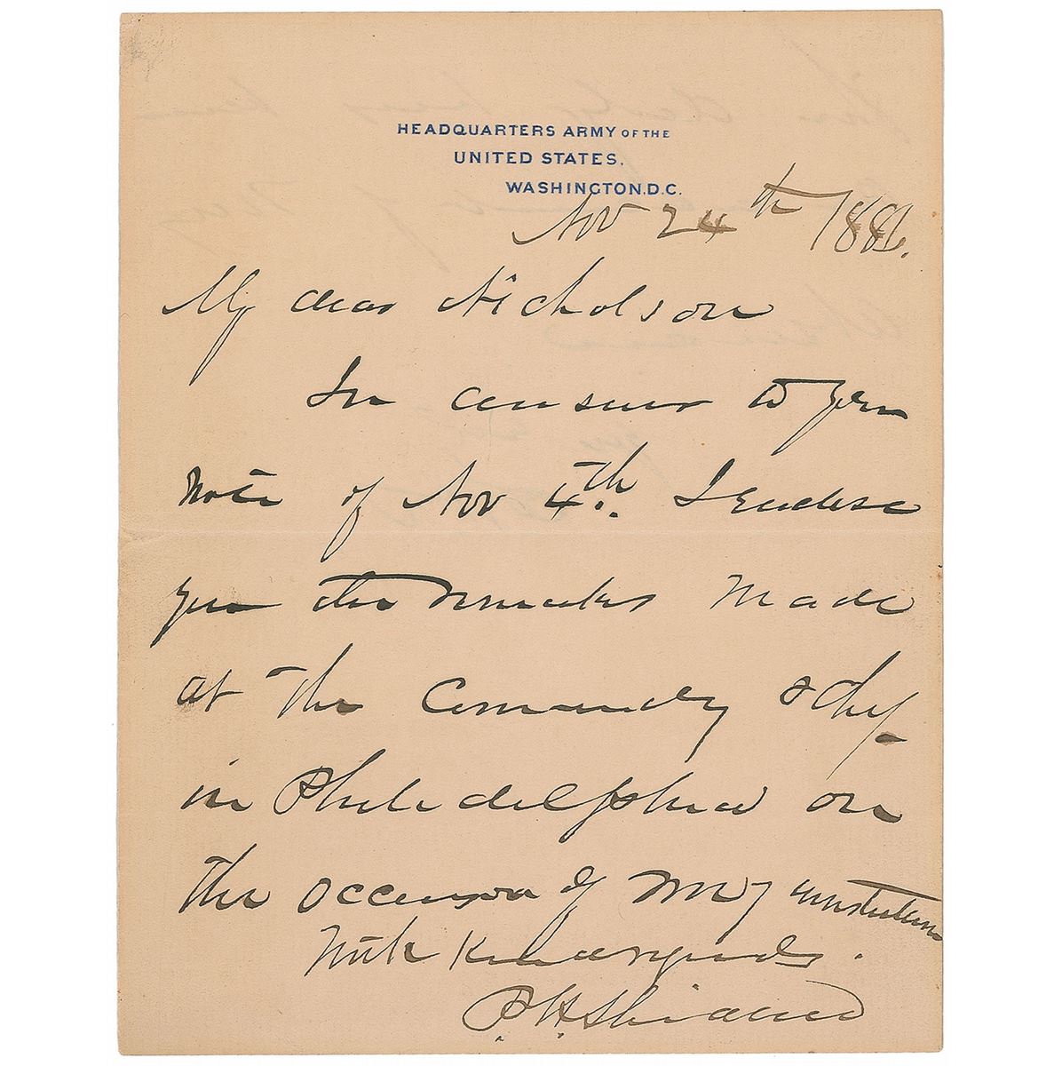 Union general (1831–1888) whose cavalry command blocked Lee’s escape at Appomattox. ALS signed “P. H. Sheridan,” one page both sides, 5.25 x 6.5, Headquarters Army of the United States letterhead, November 24, 1881. Letter to Mr. Nicholson, in part: “In answer to your note of Nov. 4th, I enclose you the remarks made…in Philadelphia.” Sheridan also signs with his initials below a postscript on the reverse, “The delay has been on account of my absence.” Adjoined blank page mostly detached but not detracting from overall presentation. In fine condition, with slight spreading to ink in a few letters (including the first letter of his initials).