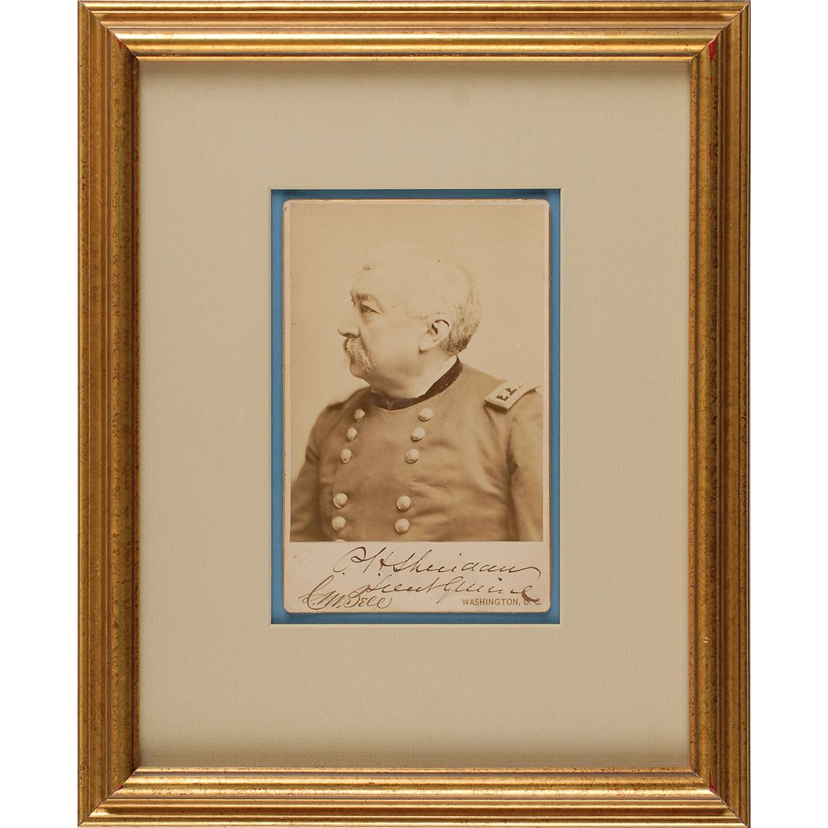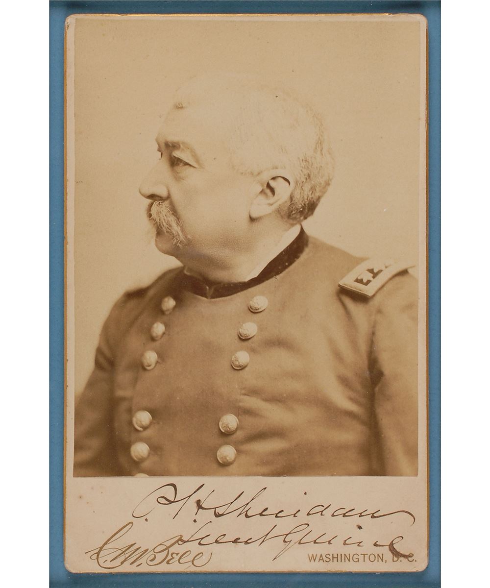 Crystal-clear 4.25 x 6.5 cabinet photo of Sheridan wearing his military uniform and pictured in profile, neatly signed on the mount in black ink, “P. H. Sheridan, Lieut. General.” Published by C. M. Bell of Washington. Attractively matted and framed to an overall size of 10.5 x 13. In fine condition.