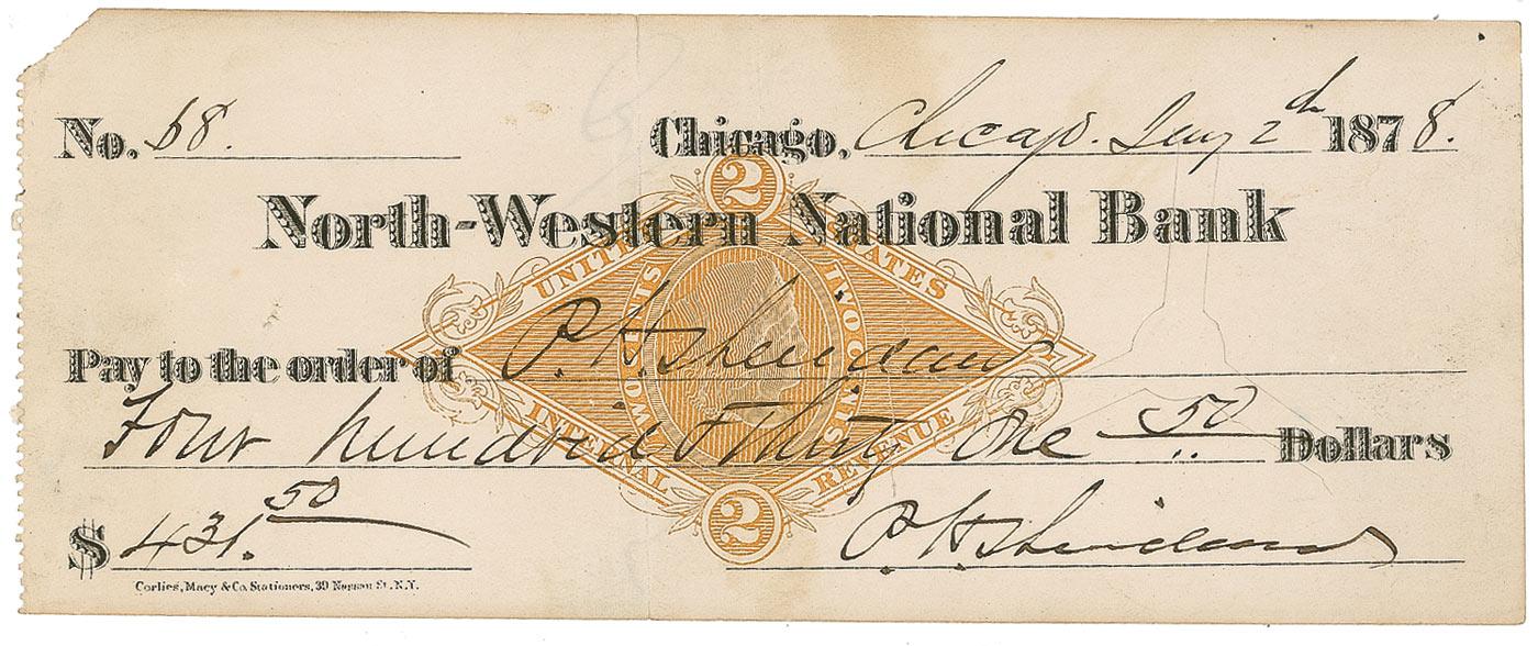 Bank check, 6.75 x 2.75, filled out and signed by Sheridan, “P. H. Sheridan,” payable to “P. H. Sheridan” for $431.50, January 2, 1878. Also endorsed on the reverse, “P. H. Sheridan.” In very good condition, with two cancellation cuts to body, several vertical folds, staple hole to left side, and scattered toning, some affecting endorsement signature. Pre-certified PSA/DNA and RRAuction COA.