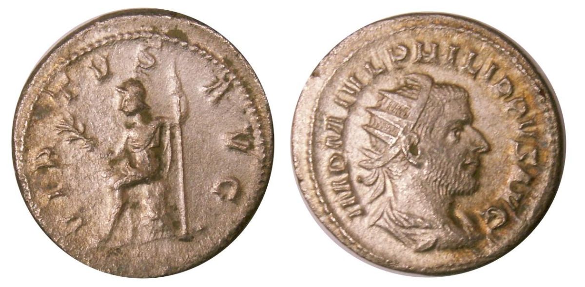 Philip I AR Antoninianus. IMP M IVL PHILIPPVS AVG, radiate draped bust right / VIRTVS AVG, Virtus standing left holding branch & spear. Ex. Vel Garnet Collection.
