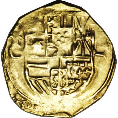 <B>Philip II gold 2 Escudos ND (1556-98),</B></I> Toledo Mint, C Assayer, F-170, 6.76 gm, crude XF and very scarce.