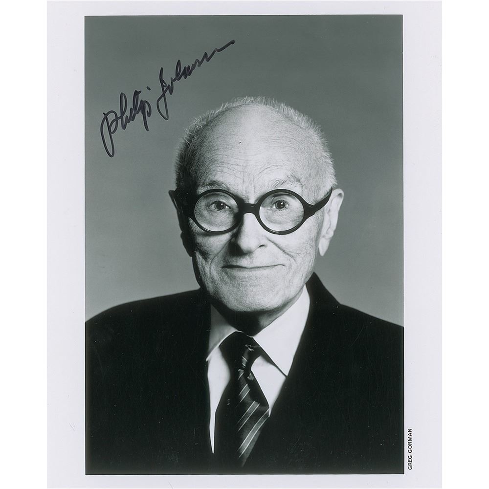 Satin-finish 8 x 10 photo of Philip Johnson, signed in black felt tip. In fine condition, with a light vertical bend touching the top of Johnson's head.