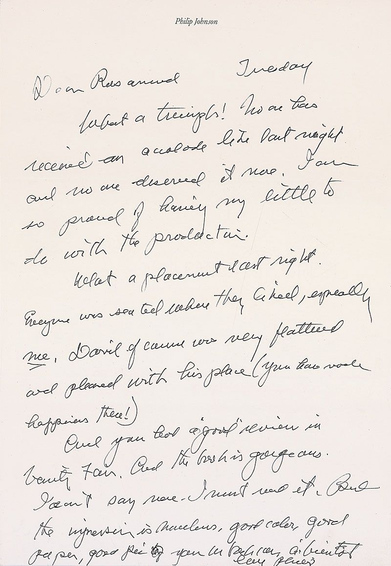Influential architect (1906–2005). ALS, signed “Philip,” one page, 7.25 x 10.5, personal letterhead, no date. Letter to Rosamund Russell. In part: “What a triumph! No one has received an accolade like last night and no one deserved it more. I am so proud of having my little to do with the production…And you had a good review in Vanity Fair. And the book is gorgeous. I can’t say more. I must read it. But the impression is nucleus, good color, good paper.” In fine condition.