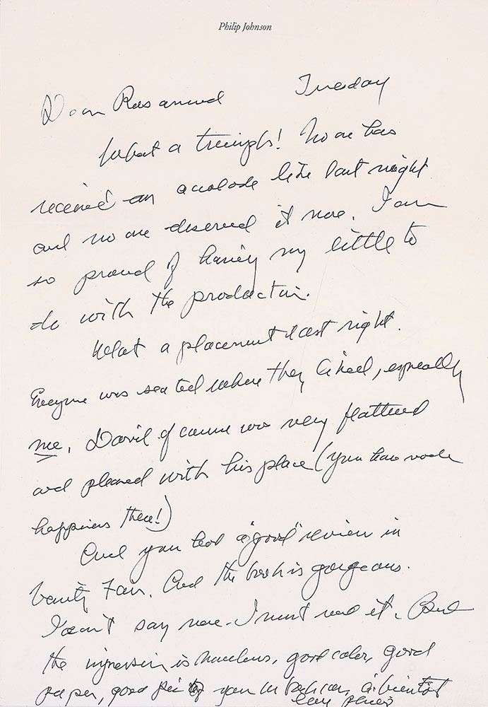 Influential architect (1906–2005). ALS, signed “Philip,” one page, 7.25 x 10.5, personal letterhead, no date. Letter to Rosamund Russell. In part: “What a triumph! No one has received an accolade like last night and no one deserved it more. I am so proud of having my little to do with the production…And you had a good review in Vanity Fair. And the book is gorgeous. I can’t say more. I must read it. But the impression is nucleus, good color, good paper.” In fine condition.