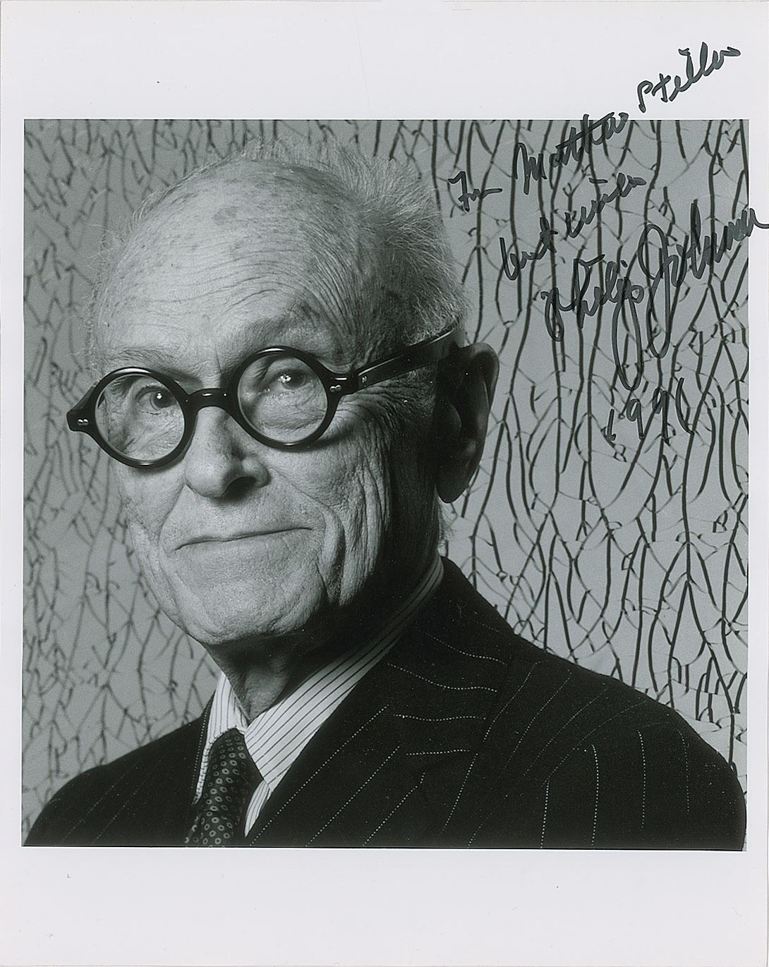 American architect (1906–2005) who is best known for his works of modern architecture, including the Glass House in New Canaan, Connecticut, and his works of postmodern architecture; in 1978, he was awarded an American Institute of Architects Gold Medal, and in 1979, the first Pritzker Architecture Prize. Matte-finish 8 x 10 head-and-shoulders portrait of the visionary architect, signed and inscribed in black felt tip, and dated 1991. Reverse bears a Luca Vignelli credit stamp. In fine condition, with rippling along the side edges.