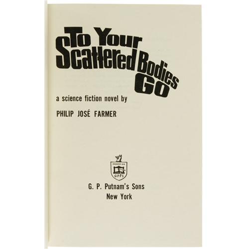 <B>Philip José Farmer:<I> To Your Scattered Bodies Go.</B></I></B></I> (New York: G. P. Putnam's Sons, 1971), first edition, 221 pages, black cloth with gilt titles, 8vo (5.75" x 8.25"), fine in a fine unclipped jacket. 1972 Hugo award winner for best novel. <I>From the Ventura Collection.</B></I><BR><BR><b>Shipping:</b> Books & Catalogs (<a target="_blank" href="http://www.heritageauctions.com/common/shipping.php">view shipping information</a>)