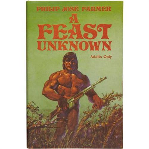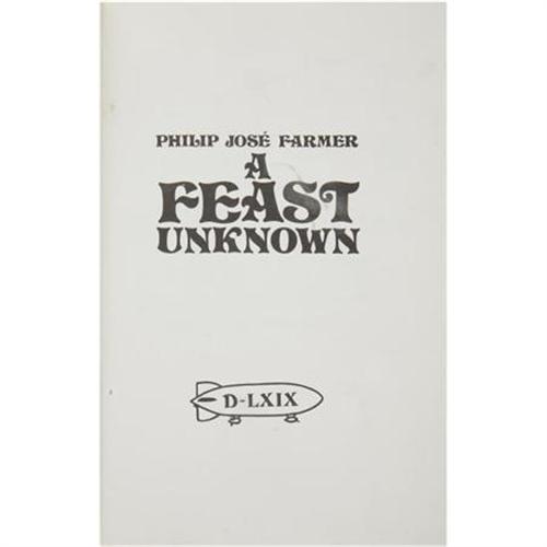 <B>Philip Jose Farmer. </B></I><B><I>A Feast Unknown: </B></I></B></I><I>Volume IX of the Memoirs of Lord Grandrith</B></I>. [Kansas City]: The Fokker D-LXIX Press, 1975. <BR><BR>First hardcover edition. Currey indicates that one thousand copies were printed of which only two hundred were bound and signed by the author and illustrator, Rich Corben on the title page. This copy is one of the 200 signed editions. Octavo. 286 pages. <BR><BR>Red cloth with titles in gilt on the spine and front board. Bright dust jacket with minimal shelf wear. A fine copy with virtually no flaws. <I>From the Robert and Diane Yaspan Collection.</B></I><BR><BR><b>Shipping:</b> Books & Catalogs (<a target="_blank" href="http://www.heritageauctions.com/common/shipping.php">view shipping information</a>)