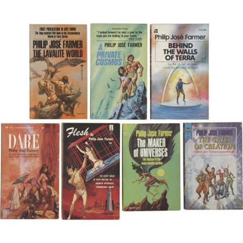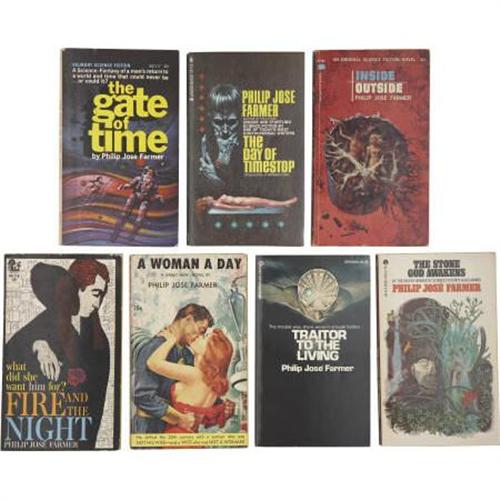 <B>Philip Jose Farmer. Collection of 14 Paperbacks, Eight Signed,</B></I> including: <B><I>Traitor to the Living.</B></I></B></I> New York: Ballantine Books, [1973]. First printing. Sixteenmo. 220 pages. Illustrated wrappers. Fine condition. [and:] <B><I>The Lavalite World</B></I></B></I>. New York: Ace Books, [1977]. First printing. Sixteenmo. 282 pages. Illustrated wrappers. Fine condition. [and:] <B><I>The Gate of Time</B></I></B></I>. New York: Belmont Books, [1966]. First printing. Signed by the author on the blurb page. Sixteenmo. 176 pages. Illustrated wrappers. Spine skewed, else very good condition. [and:] <B><I>Fire and the Night</B></I></B></I>. Evanston, Illinois: Regency Books, [1962]. First printing. Sixteenmo. 158 pages. Illustrated wrappers. Mild wear to the wrappers, else fine condition. [and:] <B><I>A Woman a Day</B></I></B></I>. New York: Beacon Books, [1960]. First printing. Sixteenmo. 160 pages. Illustrated wrappers. Very good condition. [and:] <B><I>The Stone God Awakens</B></I></B></I>. New York: Ace Books, [1970]. First printing. Signed by the author on the blurb page. Sixteenmo. 190 pages. Illustrated wrappers. Minimal wear to the wrappers, else fine condition. [and:] <B><I>The Gates of Creation</B></I></B></I>. New York: Ace Books, [1966]. First printing. Signed by the author on the title page. Sixteenmo. 159 pages. Illustrated wrappers. Fine condition. [and:] <B><I>A Private Cosmos</B></I></B></I>. New York: Ace Books, [1968]. First printing. Signed by the author on the title page. Sixteenmo. 220 pages. Illustrated wrappers. Fine condition. [and:] <B><I>Behind the Walls of Terra</B></I></B></I>. New York: Ace Books, [1970]. First printing. Signed by the author on the title page. Sixteenmo. 188 pages. Illustrated wrappers. Light shelf wear, else fine condition. [and:] <B><I>Dare</B></I></B></I>. New York: Ballantine Books, [1965]. First printing. Sixteenmo. 159 pages. Illustrated wrappers. Fine condition. [and:] <B><I>Flesh</B></I></B></I>. New York: Beacon Books, [1960]. Sixteenmo. 160 pages. Illustrated wrappers. Spine skewed, else fine condition. [and:] <B><I>The Maker of Universes</B></I></B></I>. New York: Ace Books, [1965]. First printing. Signed by the author on the copyright page. Sixteenmo. 191 pages. Illustrated wrappers. Fine condition. [and:] <B><I>Inside Outside</B></I></B></I>. New York: Ballantine Books, [1964]. Signed by the author on the blurb page. Sixteenmo. 156 pages. Illustrated wrappers. Very good condition. [and:] <B><I>The Day of Timestop</B></I></B></I>. New York: Lancer Books, [1968]. First printing. Sixteenmo. 192 pages. Illustrated wrappers. Light wrinkling to the spine, also skewed, else fine condition. <I>From the Robert and Diane Yaspan Collection.</B></I><BR><BR><b>Shipping:</b> Books & Catalogs (<a target="_blank" href="http://www.heritageauctions.com/common/shipping.php">view shipping information</a>)