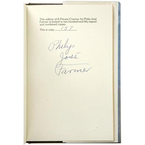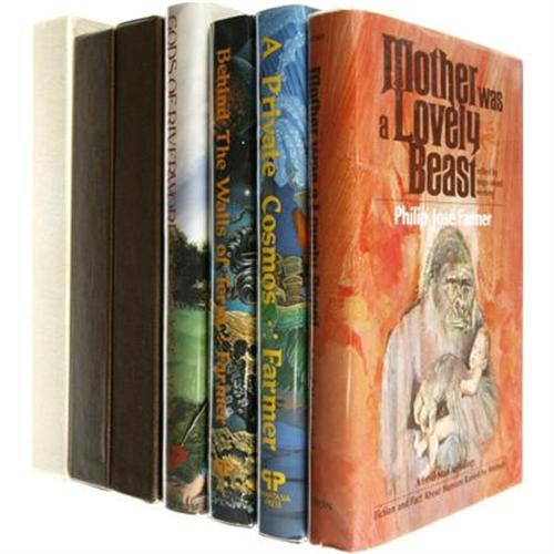 <B>Philip Jose Farmer: First Edition Book Lot.</B></I> Includes the following:<BR><B><I>Mother Was a Lovely Beast.</B></I></B></I> (Radnor, PA: Chilton Book Company, 1974), first edition, 246 pages, white boards, 8vo, dust jacket. Condition (book/ dj): fine/ fine.<BR><B><I>A Private Cosmos.</B></I></B></I> (Huntington Woods, MI: Phantasia Press, 1981), limited signed first edition, 208 pages, brown boards, 8vo, dust jacket with slipcase. Condition (book/ dj): fine/ fine.<BR><B><I>Behind the Walls of Terra.</B></I></B></I> (Huntington Woods, MI: Phantasia Press, 1982), limited signed first edition, 222 pages, brown boards, 8vo, dust jacket with slipcase. Condition (book/ dj): fine/ fine.<BR><B><I>Gods of Riverwood.</B></I></B></I> (Huntington Woods, MI: Phantasia Press, 1983), limited first edition in slip case, 279 pages, white boards, 8vo, dust jacket with slipcase. Condition (book/ dj): fine/ fine.<BR><BR><b>Shipping:</b> Books & Catalogs (<a target="_blank" href="http://www.heritageauctions.com/common/shipping.php">view shipping information</a>)