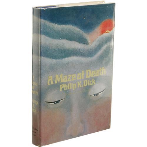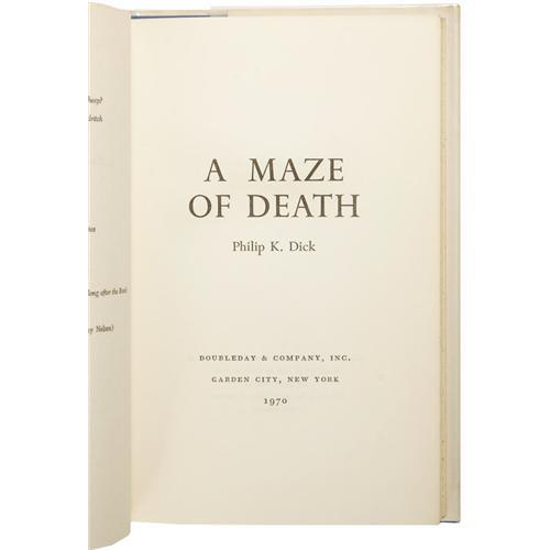 <B>Philip K. Dick:<I> A Maze of Death.</B></I></B></I> (New York: Doubleday & Company, Inc., 1970), first edition, 216 pages, jacket by Michelle Moschella, blue cloth with silver titles, 8vo (5.75" x 8.5"), stamped "Property of Science Fiction Writers of America" on endpapers and author's forward page, else fine in a fine unclipped jacket. <I>From the Ventura Collection.</B></I><BR><BR><b>Shipping:</b> Books & Catalogs (<a target="_blank" href="http://www.heritageauctions.com/common/shipping.php">view shipping information</a>) <BR><BR><B>Important notice:</