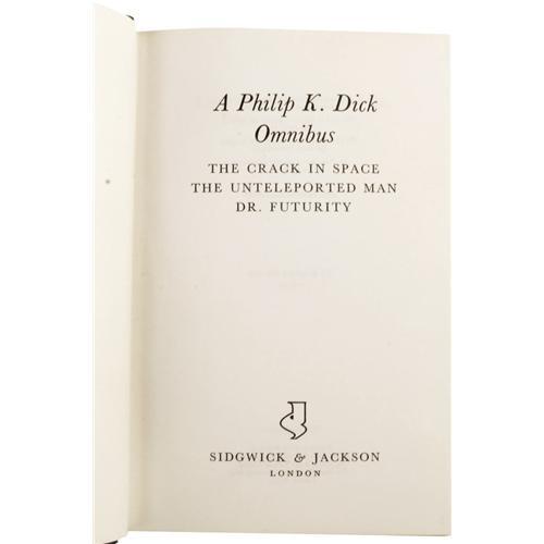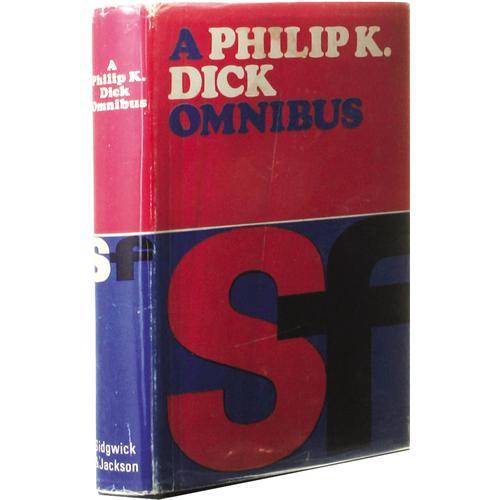 <B>Philip K. Dick:<I> A Philip K. Dick Omnibus.</B></I></B></I> (London: Sidgwick & Jackson, 1970), first edition, 138 pages, blue boards with silver titles, 12mo (5.25" x 7.5"), book block slightly cocked, foxing to prelims, else near fine in a lightly foxed and shelf worn unclipped jacket. Marks the first hardcover publication for all the titles contained. <I>From the Ventura Collection.</B></I><BR><BR><b>Shipping:</b> Books & Catalogs (<a target="_blank" href="http://www.heritageauctions.com/common/shipping.php">view shipping information</a>)