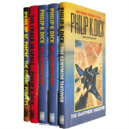 <B>Philip K. Dick: Five Book Lot.</B></I> Includes the following:<BR><B><I>The Cosmic Puppets.</B></I></B></I> (London: Severn House Publishers Ltd, 1986), first hardcover edition, 143 pages, black boards, 8vo, dust jacket. Condition (book/ dj): fine/ fine.<BR><B><I>The Ganymede Takeover.</B></I></B></I> (London: Severn House Publishers Ltd, 1988), first hardcover edition, 192 pages, blue boards, 8vo, dust jacket. Condition (book/ dj): fine/ fine.<BR><B><I>We Can Build You.</B></I></B></I> (London: Severn House Publishers Ltd., 1988), first hardcover edition, 252 pages, blue boards, 8vo, dust jacket. Condition (book/ dj): fine/ fine.<BR><B><I>We Can Build You.</B></I></B></I> (London: Severn House Publishers Ltd., 1988), first hardcover edition, 252 pages, blue boards, 8vo, dust jacket. Condition (book/ dj): fine/ fine.<BR><B><I>The Crack in Space.</B></I></B></I> (London: Severn House Publishers Ltd., 1989), first hardcover edition, 188 pages, black boards, 8vo, dust jacket. Condition (book/ dj): very good/ fine.<BR><BR><BR><b>Shipping:</b> Books & Catalogs (<a target="_blank" href="http://www.heritageauctions.com/common/shipping.php">view shipping information</a>)