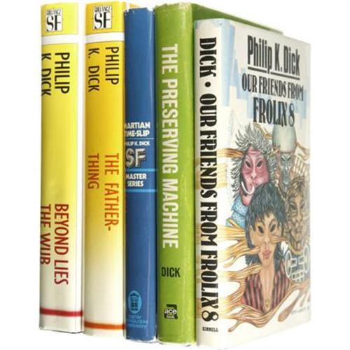 <B>Philip K. Dick: Lot of Five Books.<BR></B></I> Includes the following:<BR><B><I>The Preserving Machine.</B></I></B></I> (New York: Ace Books, Inc., 1969), book club edition, 314 pages, grey boards, 8vo, dust jacket. Condition (book/ dj): very good/ good.<BR><B><I>Martian Time Slip.</B></I></B></I> (London: New English Library, 1976), later printing, 240 pages, blue boards, 8vo, dust jacket. Condition (book/ dj): very good/ good.<BR><B><I>Beyond Lies the Wub.</B></I></B></I> (London: Victor Gollancz Ltd., 1988), first English edition, 404 pages, black boards, 8vo, dust jacket. Condition (book/ dj): fine/ fine.<BR><B><I>Our Friends From Frolix 8.</B></I></B></I> (London: Kinnell, 1989), first English edition, 211 pages, green boards, 8vo, dust jacket. Condition (book/ dj): fine/ fine.<BR><B><I>The Father-Thing.</B></I></B></I> (London: Victor Gollancz Ltd., 1989), first English edition, 376 pages, black boards, 8vo, dust jacket. Condition (book/ dj): fine/ fine.<BR><BR><BR><b>Shipping:</b> Books & Catalogs (<a target="_blank" href="http://www.heritageauctions.com/common/shipping.php">view shipping information</a>)