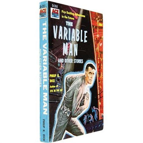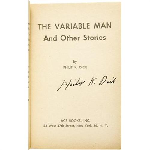 <B>Philip K. Dick: Signed <I>The Variable Man</B></I></B></I> (New York: Ace Books, 1957), 255 pages, illustrated wrappers, 16mo (4.25" x 6.75"). Signed "<I>Philip K. Dick</B></I>" on the title page. Fine condition.<BR><BR><b>Shipping:</b> Books & Catalogs (<a target="_blank" href="http://www.heritageauctions.com/common/shipping.php">view shipping information</a>)