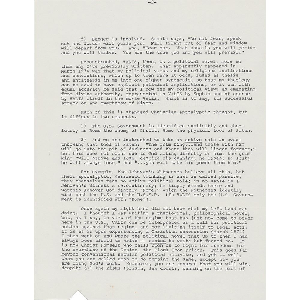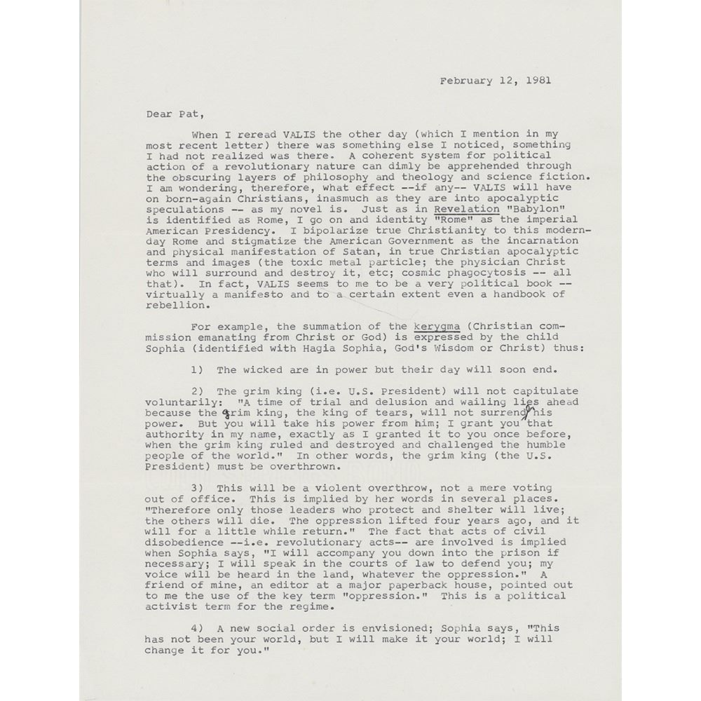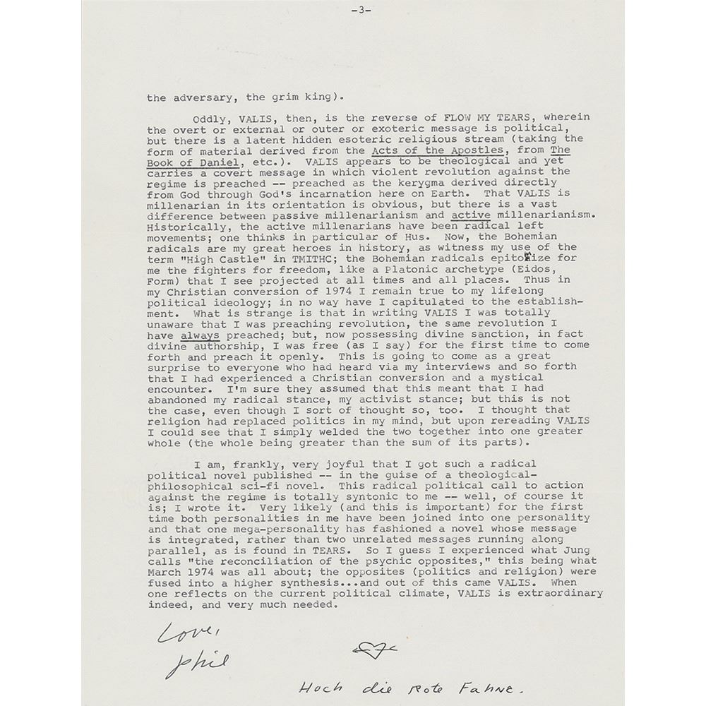 TLS signed “Love, Phil,” who adds a heart with arrow and writes in his own hand, "Hoch die Rote Fahne" [Raise the red flag], three pages, 8.5 x 11, February 12, 1981. Lengthy letter to science fiction author Patricia Warrick, in part: “When I read VALIS the other day (which I mention in my most recent letter) there was something else I noticed, something had not realized was there. A coherent system for political action of a revolutionary nature can dimly be apprehended through the obscuring layers of philosophy and theology and science fiction. I am wondering, therefore, what effect—if any—VALIS will have on born-again Christians, inasmuch as they are into apocalyptic speculations—as my novel is. Just as in Revelation ‘Babylon’ is identified as Rome, I go on and identify ‘Rome’ as the imperial American Presidency. I bipolarize true Christianity to this modern-day Rome and stigmatize the American Government as the incarnation and physical manifestation of Satan, in true Christian apocalyptic terms and images (the toxic metal particle; the physician Christ who will surround and destroy it, etc; cosmic phagocytosis—all that). In fact, VALIS seems to me to be a very political book—virtually a manifesto and to a certain extent even a handbook of rebellion.