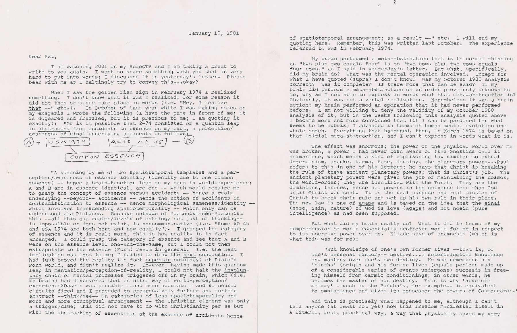 He continues: "My brain performed a meta-abstraction that is to normal thinking as 'two plus two equals four' is to 'two cows plus two cows equals four cows,' as I said in yesterday's letter. But what, specifically, did my brain do? What was the mental operation involved…Was my October 1980 analysis correct? Was it complete? Is there more that can be said? If my brain did perform a meta-abstraction on an order previously unknown to me, why am I not able to express in words what that meta-abstraction is? Obviously, it was not a verbal realization. Nonetheless it was a brain action; my brain performed an operation that it had never performed before. I am not willing to deny the validity of my October 1980 analysis of it, but in the weeks following this analysis quoted above I became more and more convinced that (if I can be pardoned for what seems to be hubris) I advanced in terms of human mental evolution one whole notch. Everything that happened, then, in March 1974 is based on that initial meta-abstraction, and I can't express in words what it is."