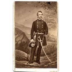 Gentleman-soldier, from a wealthy upper-class family. Served with the Chasseurs d'Afrique in Algiers, and later in Napoleon III's Imperial Guard in Italy. Lost his arm in the Mexican War. Connections with California and New Jersey. Killed at Second Manassas. CDV by Brady is more a graphic than photographic portrait of the dashing officer. Mount neatly trimmed. [3]
