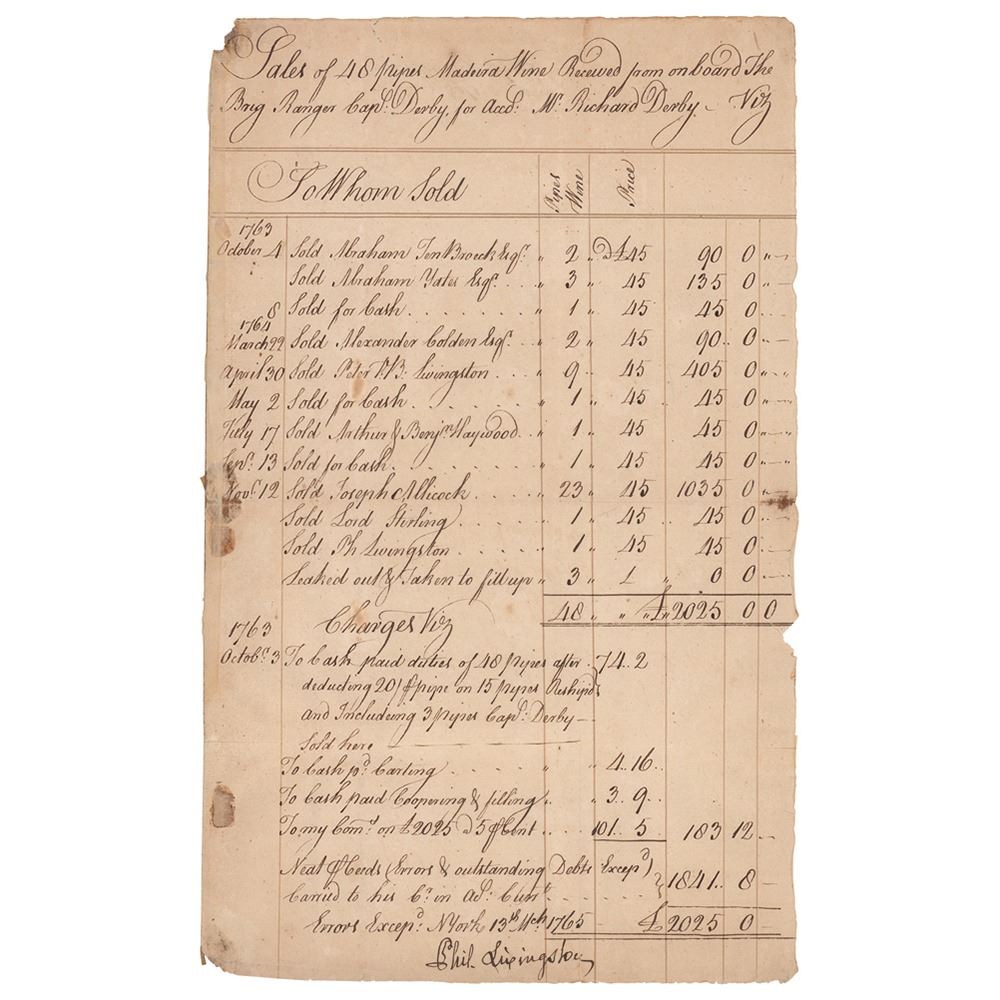 Signer of the Declaration of Independence from New York (1716-1778). Manuscript DS, signed “Phil. Livingston,†one page, 7.75 x 12.5, March 13, 1765. Accounting document headed "Sales of 48 pipes Madeira Wine Received from on board The Brig. Ranger Capt. Derby, for Acct: Mr. Richard Derby," tallying up the payments of various buyers, amounting to a total of £2025. Boldly signed at the conclusion by Livingston. In very good to fine condition, with scattered stains, edge tears, and splitting to the folds.