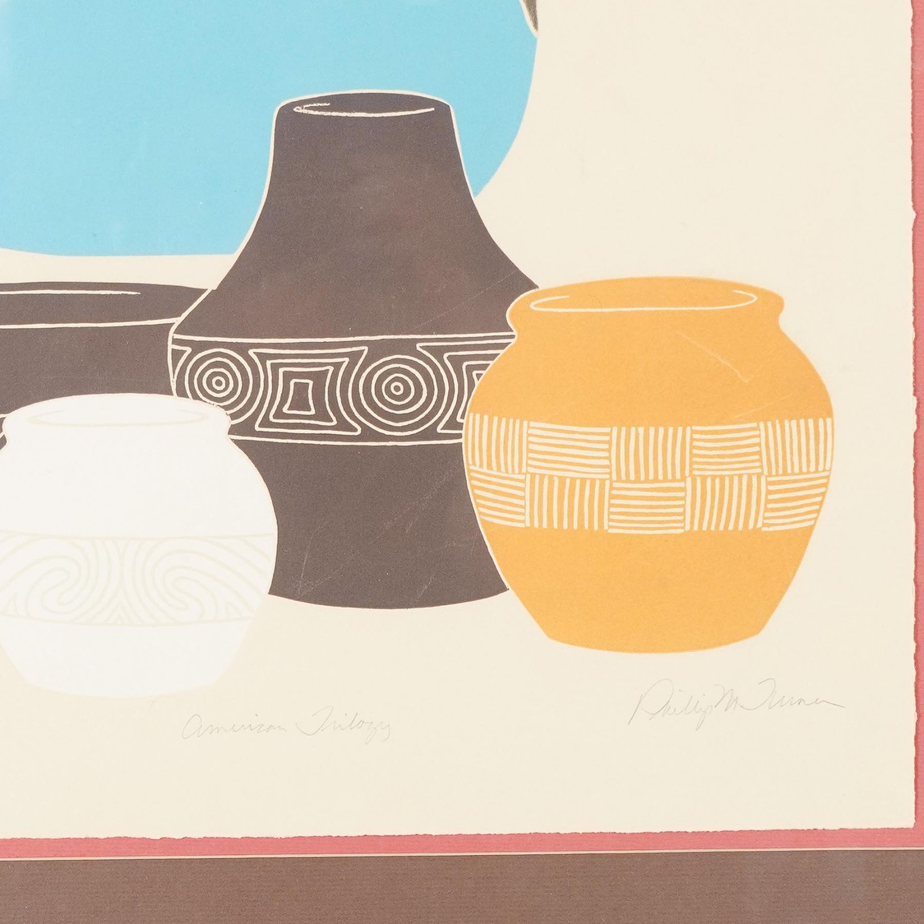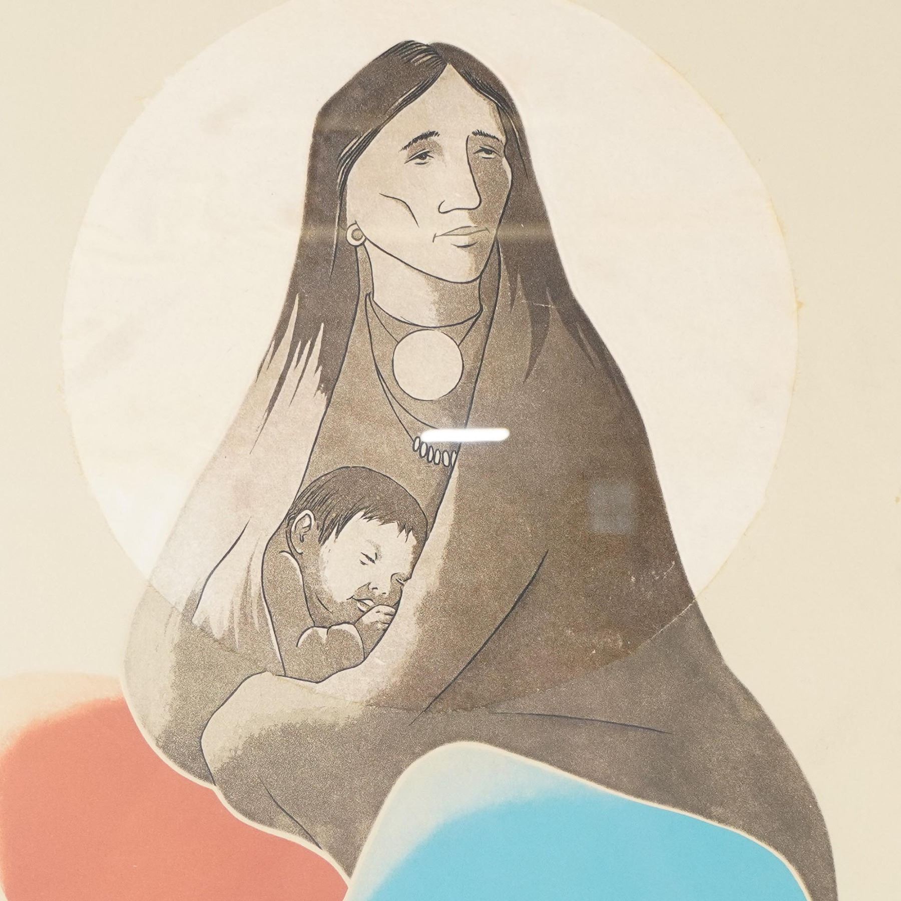 Limited edition lithograph on paper with halo cutout by Philip M. Turner titled American Trilogy, signed in pencil by the artist and numbered 248/500. This evocative composition features a Native American woman cradling a sleeping child, enveloped in a serene, contemplative aura. A circular halo-like backdrop emphasizes her presence, lending a spiritual depth to the piece. Surrounding her are traditional pottery vessels adorned with intricate geometric and organic patterns, symbolizing cultural heritage and continuity. Turner's use of soft earth tones, bold accents, and delicate shading enhances the narrative quality of the artwork, blending realism with stylized abstraction. The print exemplifies Turner's dedication to portraying Indigenous themes with reverence and artistic refinement.