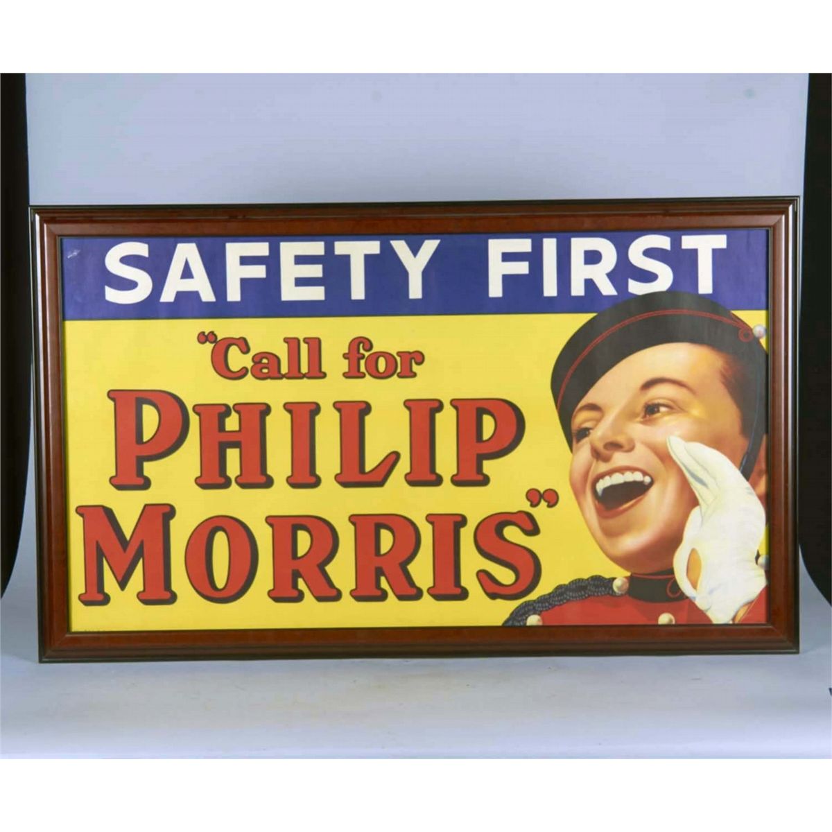 In Frame. Reads "Safety First - Call For Philip Morris" featuring Johnny The Bellboy, circa 1930s. Condition (Excellent). Size 44" x 26-3/8"