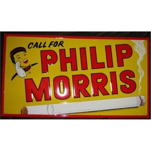 Philip Morris Embossed Tin Sign. It is marked Stout Sign Co, St. Louis, MO in the lower right corner and "Made in USA" in the lower left corner. Beautiful bold colors and great graphics! This sign looks like it was made yesterday with nearly no blemishes. You'll have trouble finding another one this nice! (HOME)