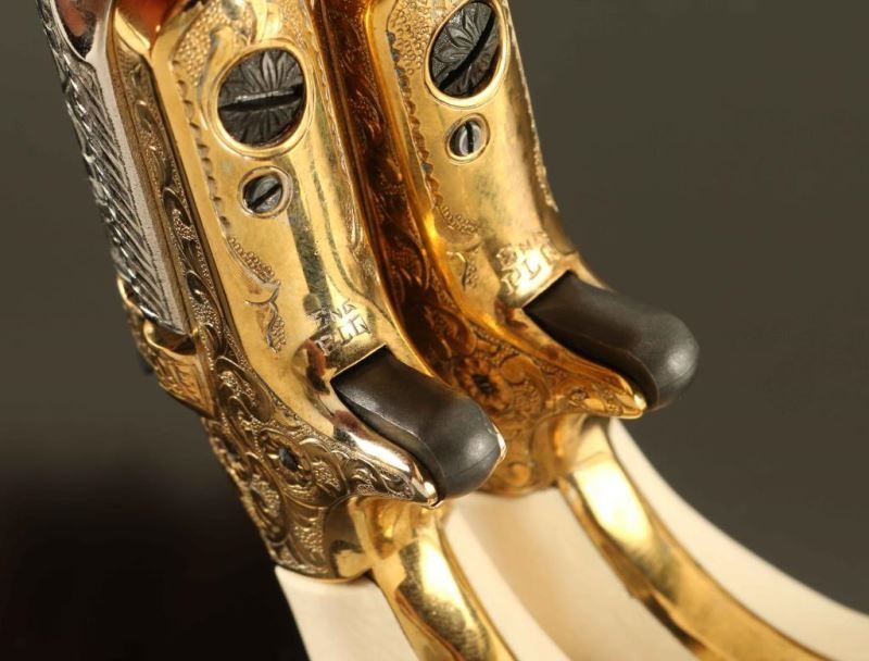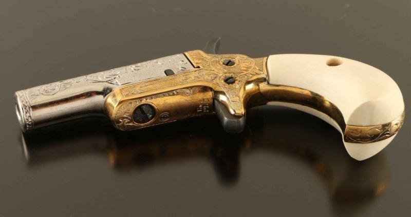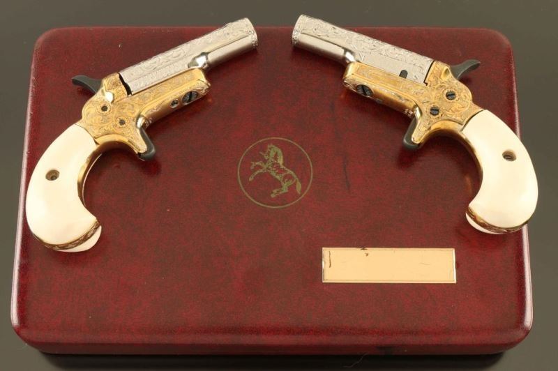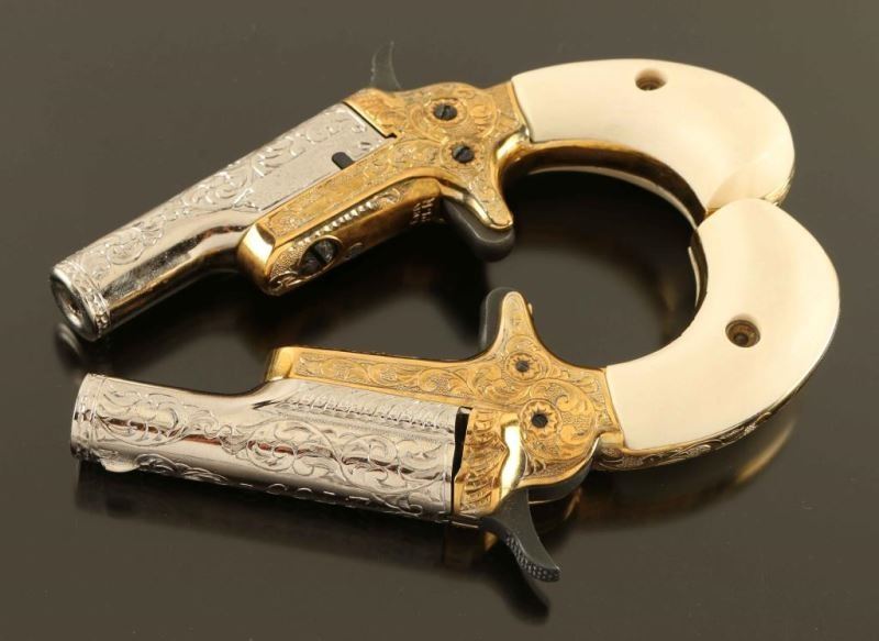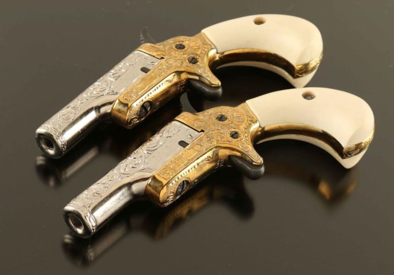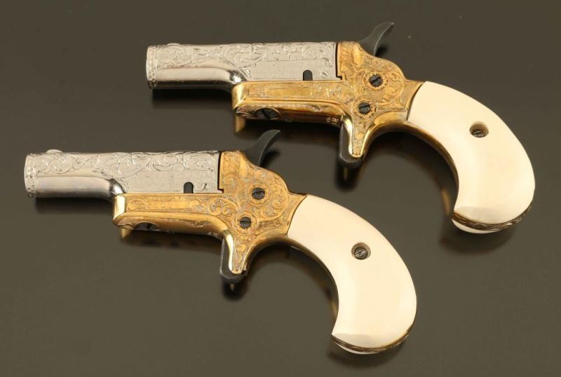 SN: 21055D/21056D Finely engraved pair of Colt fourth model derringer chambered in .22 short, manufactured circa 1959-1963. Both are in the following configuration: nickel & gold plated finish, splendid floral scroll engraving with punch dot background - signed by Mr. Quigley, 2.5" barrel, blade front sight, smooth spur trigger, checkered hammer spur and two-piece ivory grips. Includes a factory maroon presentation case with velvet lined fitted insert. Derringers exhibit nearly all of their finish showing little wear with some small blemishes under the finish on the underside of the barrels. Actions function well, the bores are fair and the unpolished ivory grips are fine. Condition is NRA Very Good. ***C&R Firearms***