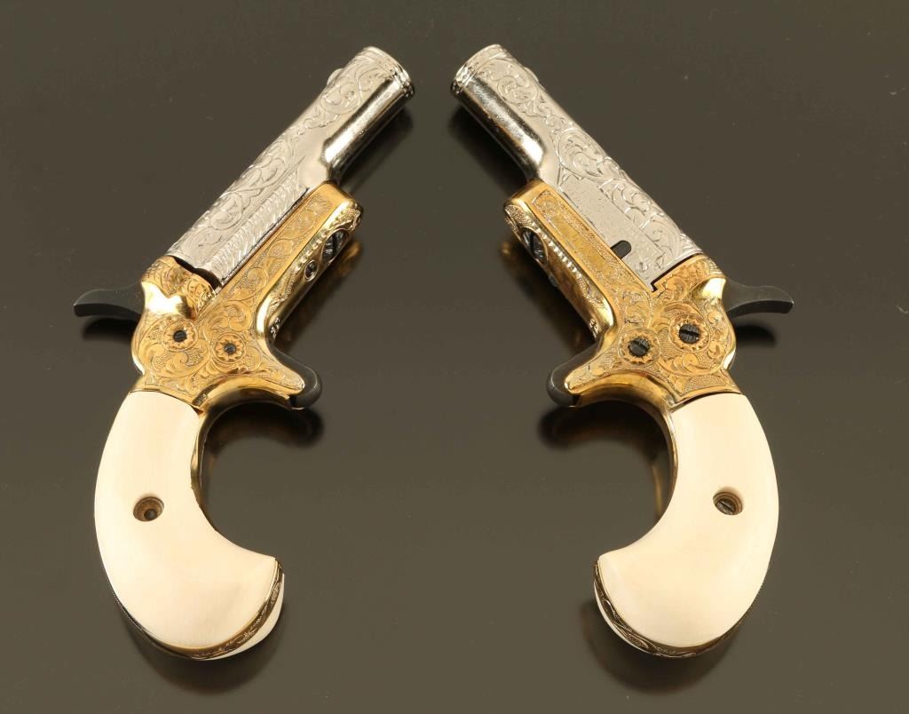 SN: 21055D/21056D Finely engraved pair of Colt fourth model derringer chambered in .22 short, manufactured circa 1959-1963. Both are in the following configuration: nickel & gold plated finish, splendid floral scroll engraving with punch dot background - signed by Mr. Quigley, 2.5" barrel, blade front sight, smooth spur trigger, checkered hammer spur and two-piece ivory grips. Includes a factory maroon presentation case with velvet lined fitted insert. Derringers exhibit nearly all of their finish showing little wear with some small blemishes under the finish on the underside of the barrels. Actions function well, the bores are fair and the unpolished ivory grips are fine. Condition is NRA Very Good. ***C&R Firearms***