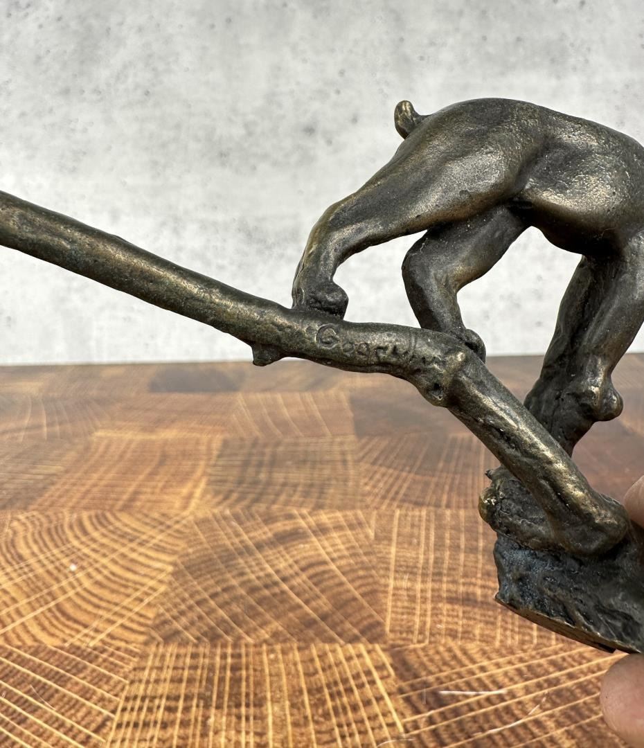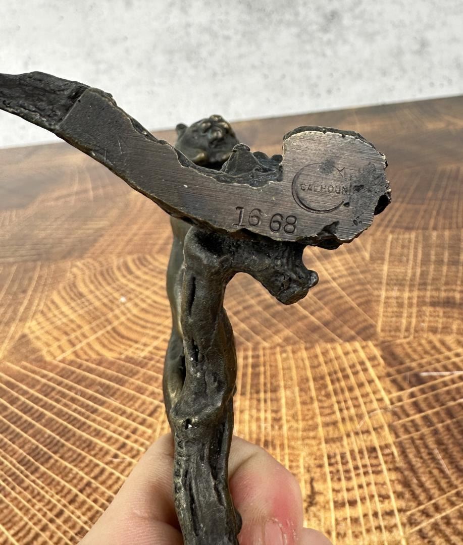 5 1/2" by 3 1/8" by 2 1/8" Philip Russell Goodwin (1881 - 1935) was active/lived in New York, Connecticut. Philip Goodwin is known for Animal, field-stream illustration. Known for his illustrations of hunting, fishing, and cowboy scenes, especially scenes featuring firearms, Philip R. Goodwin was from Norwich, Connecticut. By the age of eleven, he had already sold his first illustrations to Collier's magazine. He was educated at the Rhode Island School of Design in Providence and the Art Students' League in New York. He also studied with Howard Pyle in Pennsylvania. His works exhibit much of Pyle's earnestness and discipline, but are restricted almost entirely to subjects of hunting and fishing. In this limited area, however, he produced many notable pictures, the subject matter always convincing and dramatic in color. In his early twenties, he established a studio in New York and met Charles Russell, whose paintings of western subjects provided a great influence on Goodwin's work in that genre. Goodwin's interest in scenes of cowboys and ranch life is evident in Bronco Buster. The two men traveled together on several occasions, sketching source material for their paintings. Meanwhile, Goodwin appeared in such books as Jack London's Call of the Wild. Goodwin's pictures were also published in Harper's Monthly and Weekly, Outing, Scribner's, and Everybody's magazines, in addition to calendar subjects for Brown & Bigelow, advertising for Winchester Arms and the Marlin Firearms Company. He also illustrated African Game Trails for Theodore Roosevelt. Goodwin's interest in Charles Russell is seen not only in Goodwin's use of bright, vivid colors, but also in the romanticized subject matter, which appears to celebrate the bonding of rider and mount.