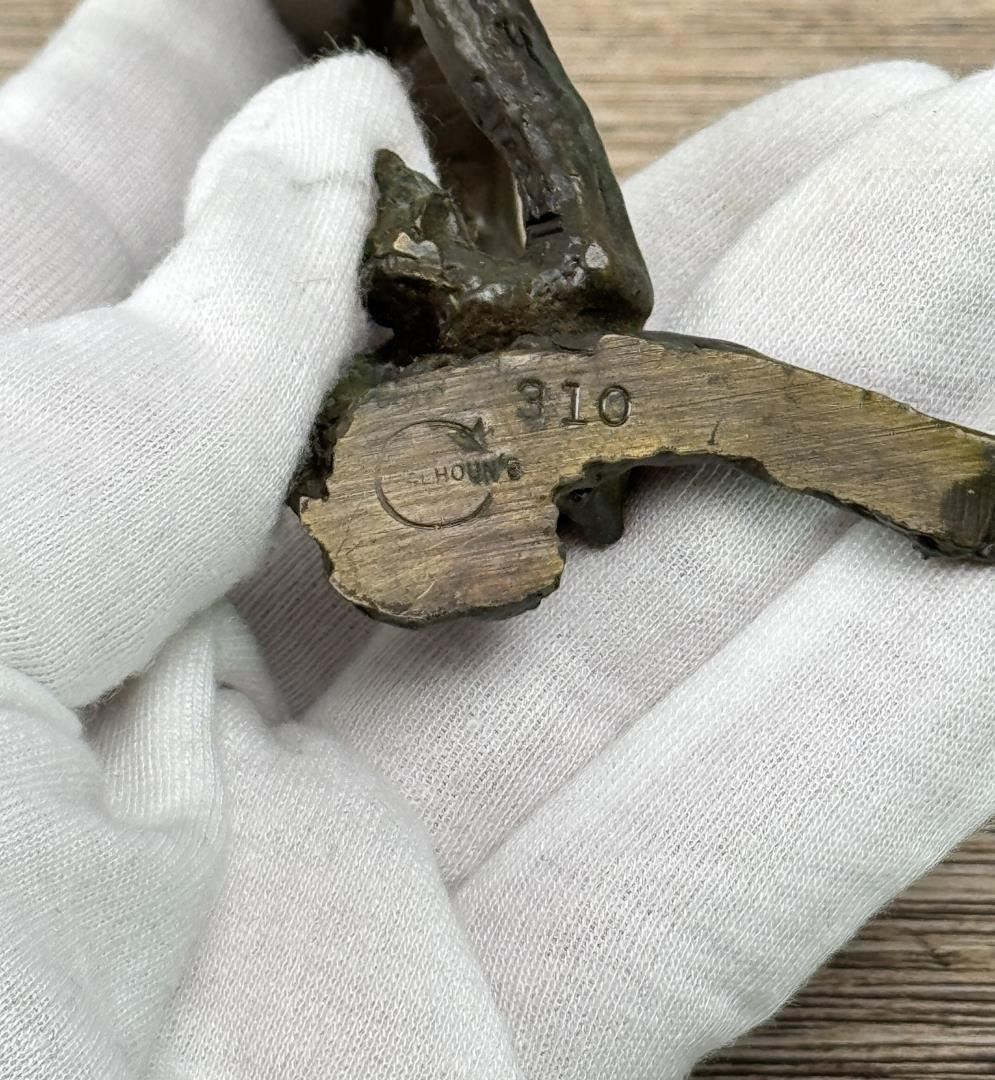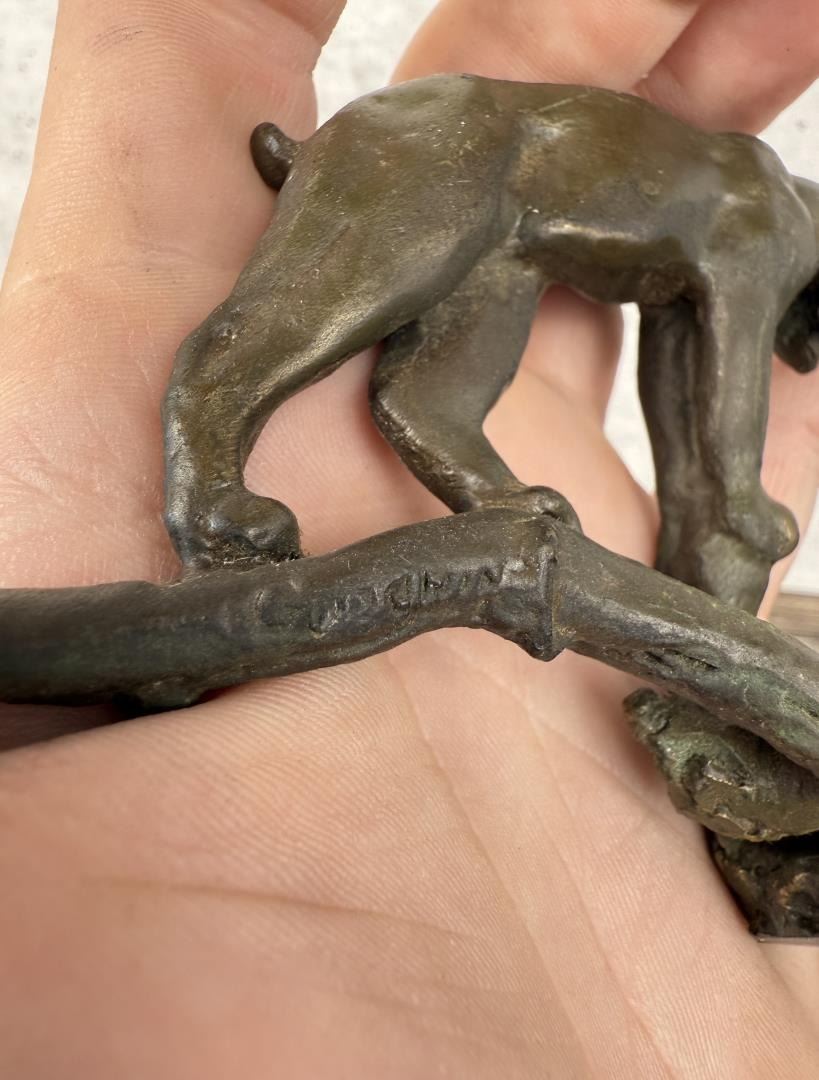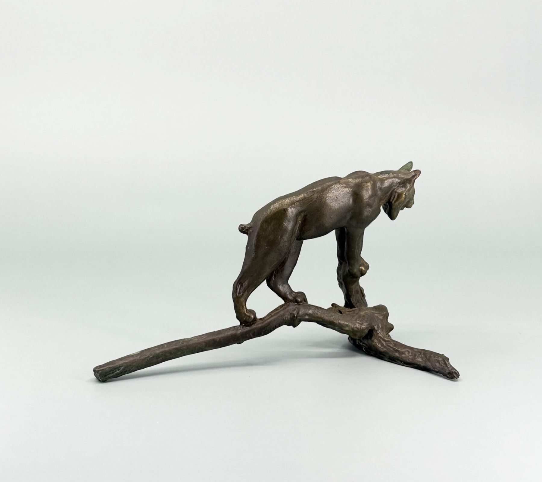 Title is Bobcat. 5 1/2" by 3 1/8" by 2 1/8" Philip Russell Goodwin (1881 - 1935) was active/lived in New York, Connecticut. Philip Goodwin is known for Animal, field-stream illustration. Known for his illustrations of hunting, fishing, and cowboy scenes, especially scenes featuring firearms, Philip R. Goodwin was from Norwich, Connecticut. By the age of eleven, he had already sold his first illustrations to Collier's magazine. He was educated at the Rhode Island School of Design in Providence and the Art Students' League in New York. He also studied with Howard Pyle in Pennsylvania. His works exhibit much of Pyle's earnestness and discipline, but are restricted almost entirely to subjects of hunting and fishing. In this limited area, however, he produced many notable pictures, the subject matter always convincing and dramatic in color. In his early twenties, he established a studio in New York and met Charles Russell, whose paintings of western subjects provided a great influence on Goodwin's work in that genre. Goodwin's interest in scenes of cowboys and ranch life is evident in Bronco Buster. The two men traveled together on several occasions, sketching source material for their paintings. Meanwhile, Goodwin appeared in such books as Jack London's Call of the Wild. Goodwin's pictures were also published in Harper's Monthly and Weekly, Outing, Scribner's, and Everybody's magazines, in addition to calendar subjects for Brown & Bigelow, advertising for Winchester Arms and the Marlin Firearms Company. He also illustrated African Game Trails for Theodore Roosevelt. Goodwin's interest in Charles Russell is seen not only in Goodwin's use of bright, vivid colors, but also in the romanticized subject matter, which appears to celebrate the bonding of rider and mount.