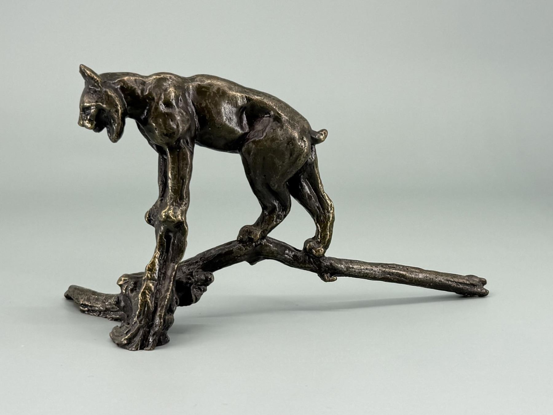 Title is Bobcat. 5 1/2" by 3 1/8" by 2 1/8" Philip Russell Goodwin (1881 - 1935) was active/lived in New York, Connecticut. Philip Goodwin is known for Animal, field-stream illustration. Known for his illustrations of hunting, fishing, and cowboy scenes, especially scenes featuring firearms, Philip R. Goodwin was from Norwich, Connecticut. By the age of eleven, he had already sold his first illustrations to Collier's magazine. He was educated at the Rhode Island School of Design in Providence and the Art Students' League in New York. He also studied with Howard Pyle in Pennsylvania. His works exhibit much of Pyle's earnestness and discipline, but are restricted almost entirely to subjects of hunting and fishing. In this limited area, however, he produced many notable pictures, the subject matter always convincing and dramatic in color. In his early twenties, he established a studio in New York and met Charles Russell, whose paintings of western subjects provided a great influence on Goodwin's work in that genre. Goodwin's interest in scenes of cowboys and ranch life is evident in Bronco Buster. The two men traveled together on several occasions, sketching source material for their paintings. Meanwhile, Goodwin appeared in such books as Jack London's Call of the Wild. Goodwin's pictures were also published in Harper's Monthly and Weekly, Outing, Scribner's, and Everybody's magazines, in addition to calendar subjects for Brown & Bigelow, advertising for Winchester Arms and the Marlin Firearms Company. He also illustrated African Game Trails for Theodore Roosevelt. Goodwin's interest in Charles Russell is seen not only in Goodwin's use of bright, vivid colors, but also in the romanticized subject matter, which appears to celebrate the bonding of rider and mount.