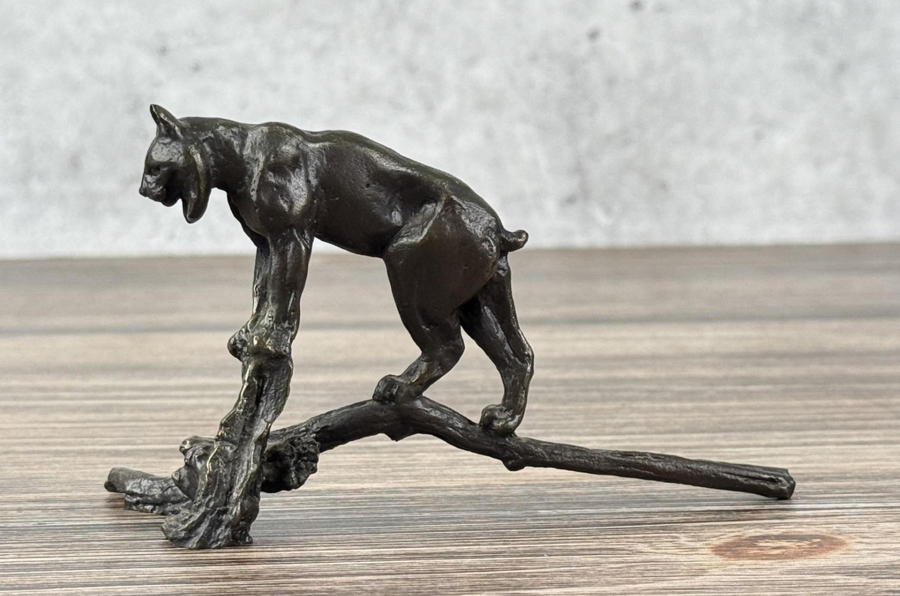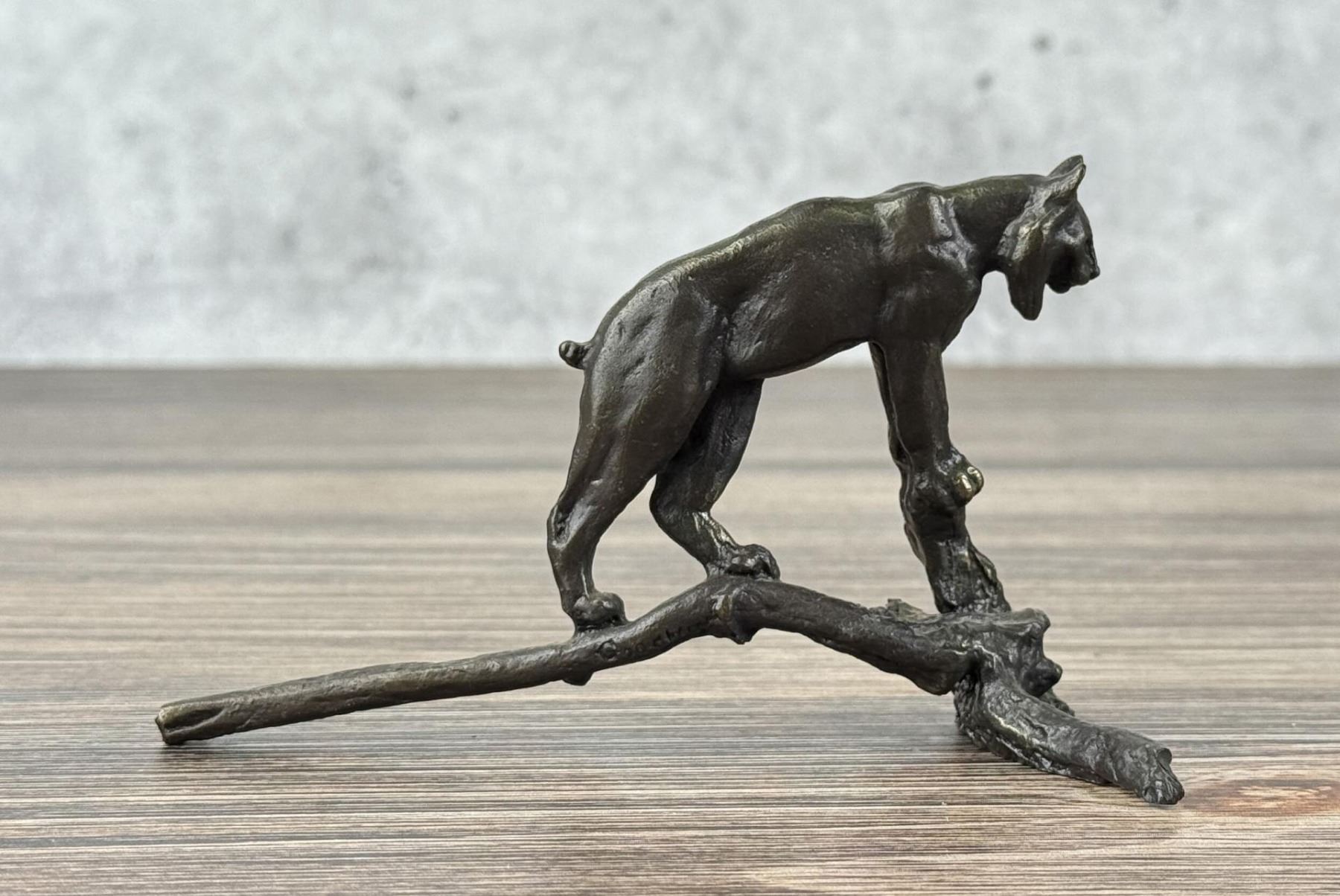 Title is Bobcat. 5 1/2" by 3 1/8" by 2 1/8" Philip Russell Goodwin (1881 - 1935) was active/lived in New York, Connecticut. Philip Goodwin is known for Animal, field-stream illustration. Known for his illustrations of hunting, fishing, and cowboy scenes, especially scenes featuring firearms, Philip R. Goodwin was from Norwich, Connecticut. By the age of eleven, he had already sold his first illustrations to Collier's magazine. He was educated at the Rhode Island School of Design in Providence and the Art Students' League in New York. He also studied with Howard Pyle in Pennsylvania. His works exhibit much of Pyle's earnestness and discipline, but are restricted almost entirely to subjects of hunting and fishing. In this limited area, however, he produced many notable pictures, the subject matter always convincing and dramatic in color. In his early twenties, he established a studio in New York and met Charles Russell, whose paintings of western subjects provided a great influence on Goodwin's work in that genre. Goodwin's interest in scenes of cowboys and ranch life is evident in Bronco Buster. The two men traveled together on several occasions, sketching source material for their paintings. Meanwhile, Goodwin appeared in such books as Jack London's Call of the Wild. Goodwin's pictures were also published in Harper's Monthly and Weekly, Outing, Scribner's, and Everybody's magazines, in addition to calendar subjects for Brown & Bigelow, advertising for Winchester Arms and the Marlin Firearms Company. He also illustrated African Game Trails for Theodore Roosevelt. Goodwin's interest in Charles Russell is seen not only in Goodwin's use of bright, vivid colors, but also in the romanticized subject matter, which appears to celebrate the bonding of rider and mount.