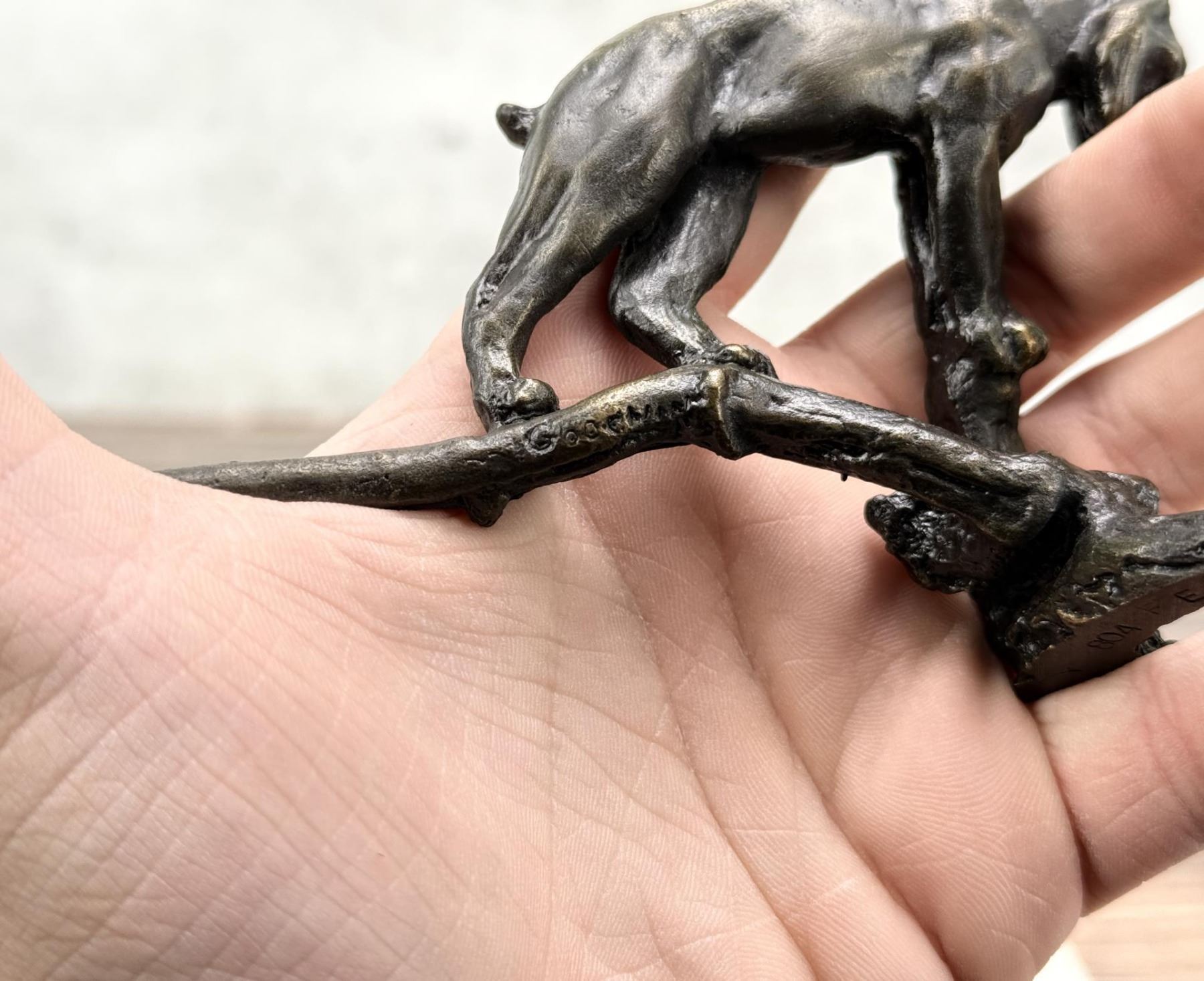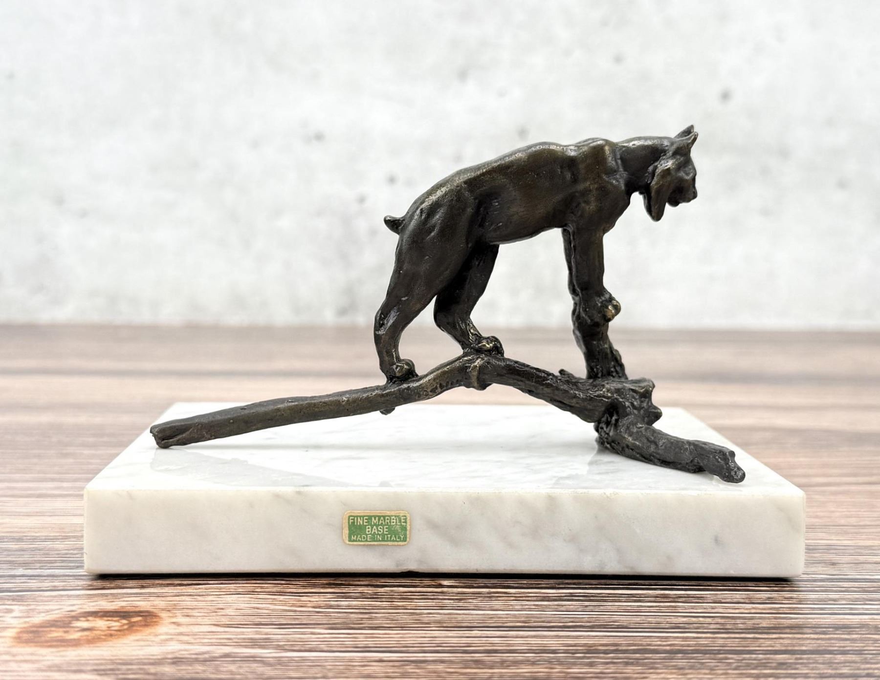 Title is Bobcat. 5 1/2" by 3 1/8" by 2 1/8", excluding marble base. Philip Russell Goodwin (1881 - 1935) was active/lived in New York, Connecticut. Philip Goodwin is known for Animal, field-stream illustration. Known for his illustrations of hunting, fishing, and cowboy scenes, especially scenes featuring firearms, Philip R. Goodwin was from Norwich, Connecticut. By the age of eleven, he had already sold his first illustrations to Collier's magazine. He was educated at the Rhode Island School of Design in Providence and the Art Students' League in New York. He also studied with Howard Pyle in Pennsylvania. His works exhibit much of Pyle's earnestness and discipline, but are restricted almost entirely to subjects of hunting and fishing. In this limited area, however, he produced many notable pictures, the subject matter always convincing and dramatic in color. In his early twenties, he established a studio in New York and met Charles Russell, whose paintings of western subjects provided a great influence on Goodwin's work in that genre. Goodwin's interest in scenes of cowboys and ranch life is evident in Bronco Buster. The two men traveled together on several occasions, sketching source material for their paintings. Meanwhile, Goodwin appeared in such books as Jack London's Call of the Wild. Goodwin's pictures were also published in Harper's Monthly and Weekly, Outing, Scribner's, and Everybody's magazines, in addition to calendar subjects for Brown & Bigelow, advertising for Winchester Arms and the Marlin Firearms Company. He also illustrated African Game Trails for Theodore Roosevelt. Goodwin's interest in Charles Russell is seen not only in Goodwin's use of bright, vivid colors, but also in the romanticized subject matter, which appears to celebrate the bonding of rider and mount.