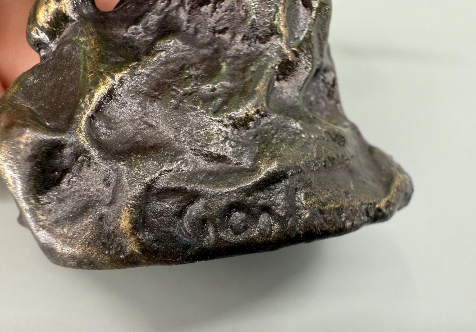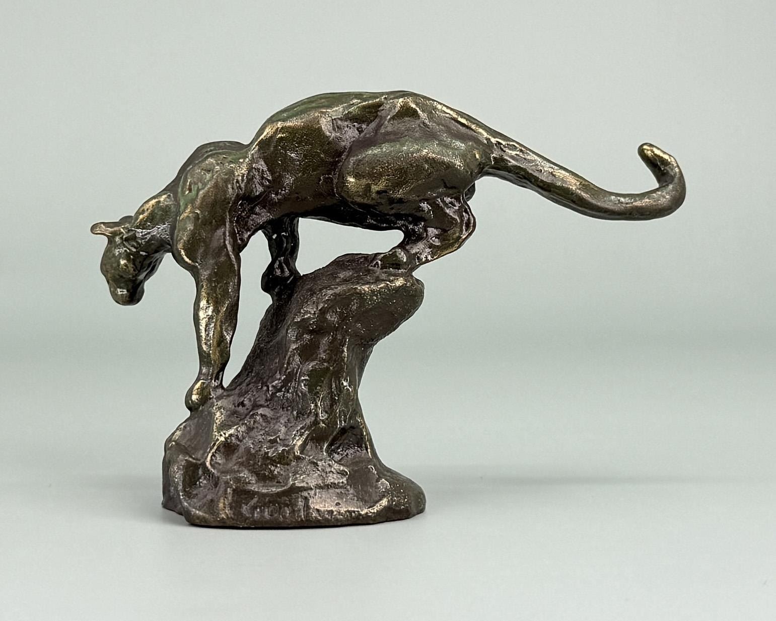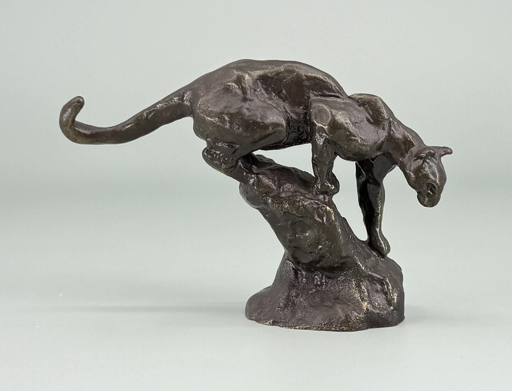 3 1/2" tall, 2 1/2" long, 1 1/4" wide. Philip Russell Goodwin (1881 - 1935) was active/lived in New York, Connecticut. Philip Goodwin is known for Animal, field-stream illustration. Known for his illustrations of hunting, fishing, and cowboy scenes, especially scenes featuring firearms, Philip R. Goodwin was from Norwich, Connecticut. By the age of eleven, he had already sold his first illustrations to Collier's magazine. He was educated at the Rhode Island School of Design in Providence and the Art Students' League in New York. He also studied with Howard Pyle in Pennsylvania. His works exhibit much of Pyle's earnestness and discipline, but are restricted almost entirely to subjects of hunting and fishing. In this limited area, however, he produced many notable pictures, the subject matter always convincing and dramatic in color. In his early twenties, he established a studio in New York and met Charles Russell, whose paintings of western subjects provided a great influence on Goodwin's work in that genre. Goodwin's interest in scenes of cowboys and ranch life is evident in Bronco Buster. The two men traveled together on several occasions, sketching source material for their paintings. Meanwhile, Goodwin appeared in such books as Jack London's Call of the Wild. Goodwin's pictures were also published in Harper's Monthly and Weekly, Outing, Scribner's, and Everybody's magazines, in addition to calendar subjects for Brown & Bigelow, advertising for Winchester Arms and the Marlin Firearms Company. He also illustrated African Game Trails for Theodore Roosevelt. Goodwin's interest in Charles Russell is seen not only in Goodwin's use of bright, vivid colors, but also in the romanticized subject matter, which appears to celebrate the bonding of rider and mount.