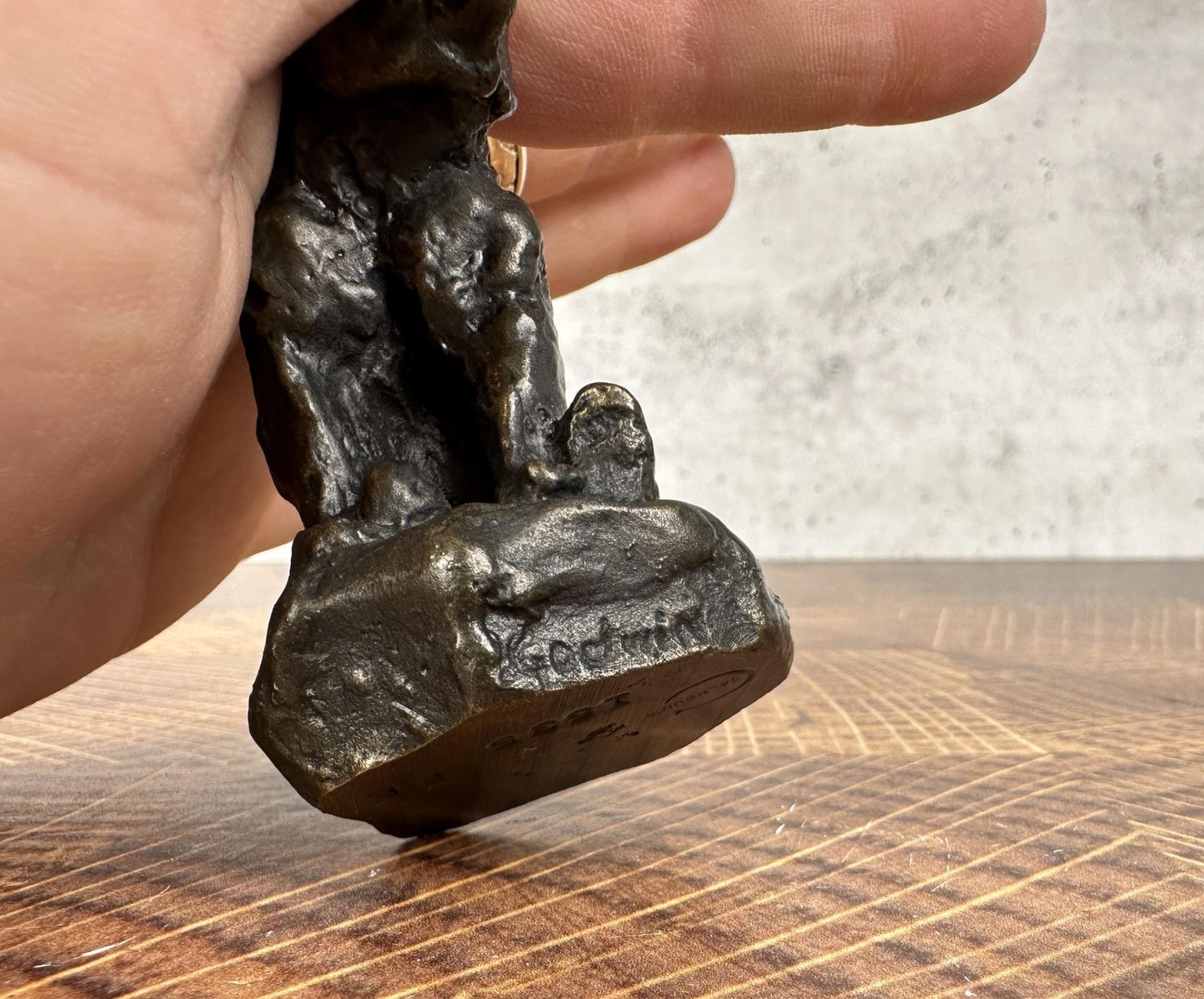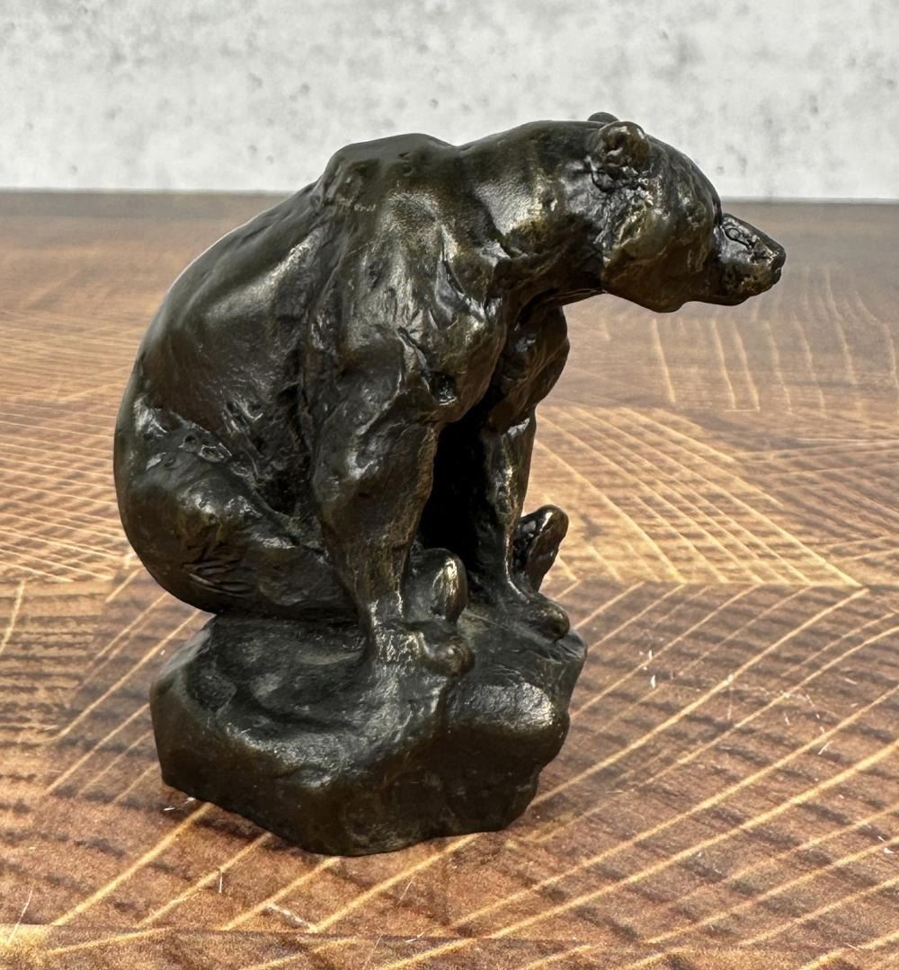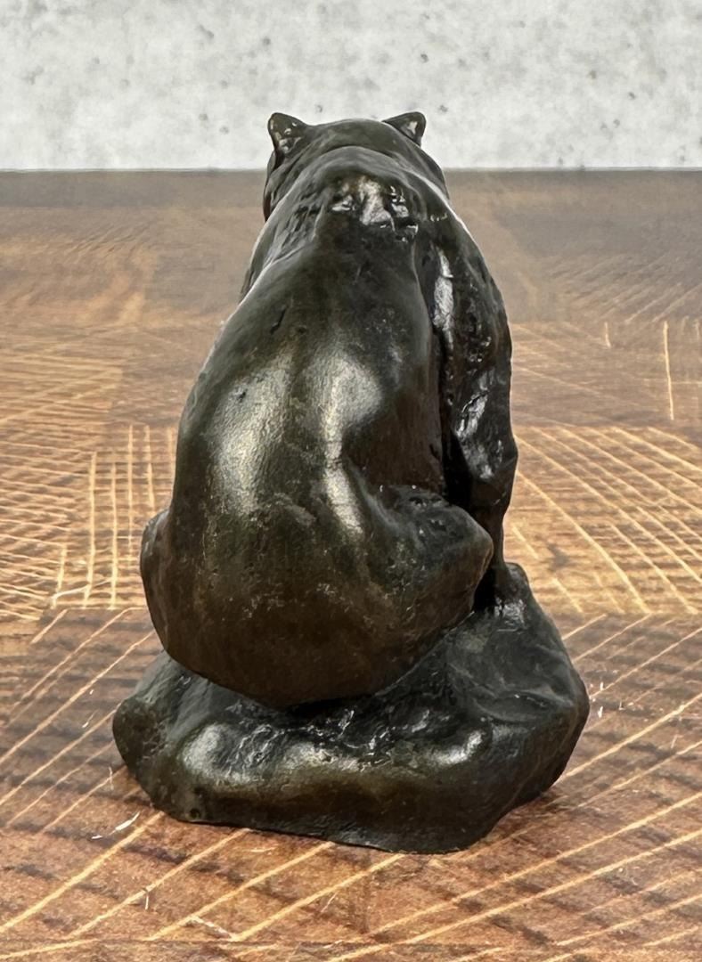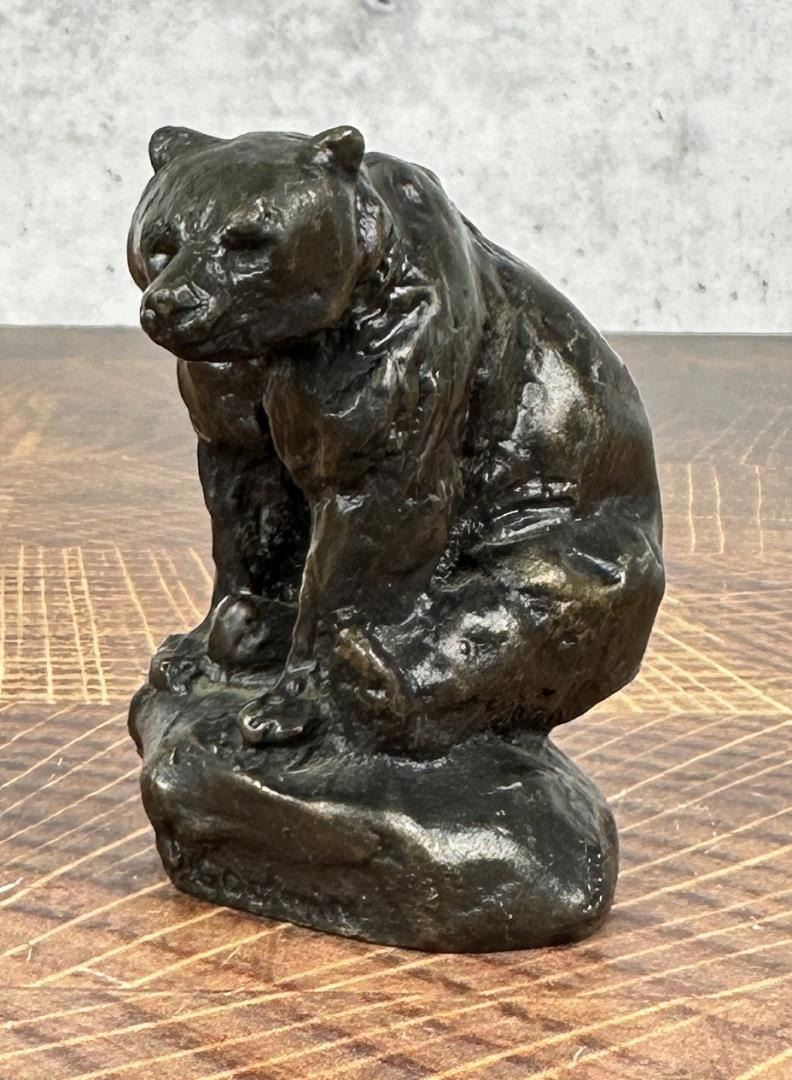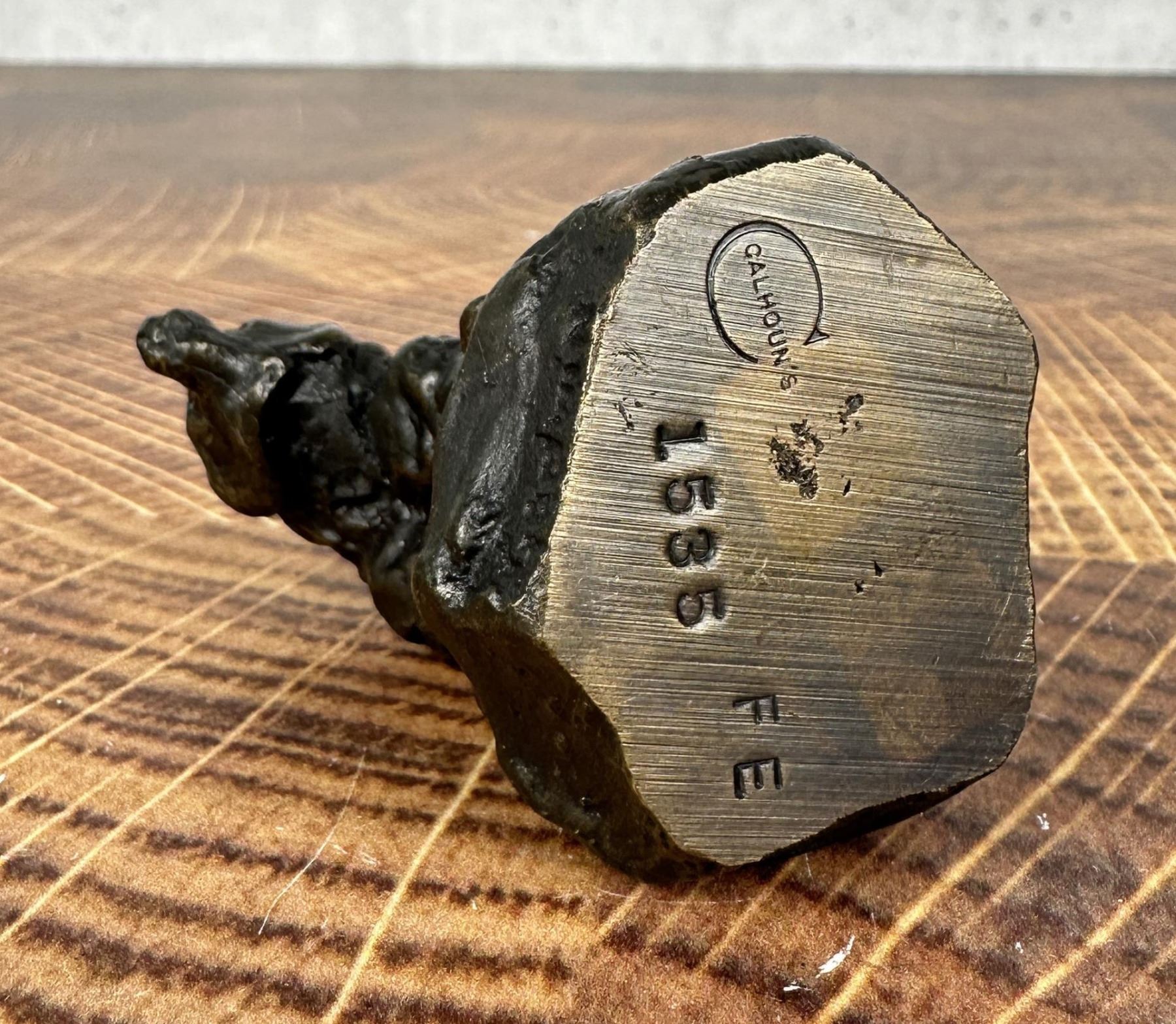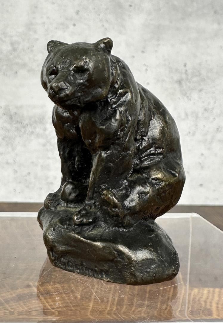 2 3/8" by 2" by 1 3/4". Philip Russell Goodwin (1881 - 1935) was active/lived in New York, Connecticut. Philip Goodwin is known for Animal, field-stream illustration. Known for his illustrations of hunting, fishing, and cowboy scenes, especially scenes featuring firearms, Philip R. Goodwin was from Norwich, Connecticut. By the age of eleven, he had already sold his first illustrations to Collier's magazine. He was educated at the Rhode Island School of Design in Providence and the Art Students' League in New York. He also studied with Howard Pyle in Pennsylvania. His works exhibit much of Pyle's earnestness and discipline, but are restricted almost entirely to subjects of hunting and fishing. In this limited area, however, he produced many notable pictures, the subject matter always convincing and dramatic in color. In his early twenties, he established a studio in New York and met Charles Russell, whose paintings of western subjects provided a great influence on Goodwin's work in that genre. Goodwin's interest in scenes of cowboys and ranch life is evident in Bronco Buster. The two men traveled together on several occasions, sketching source material for their paintings. Meanwhile, Goodwin appeared in such books as Jack London's Call of the Wild. Goodwin's pictures were also published in Harper's Monthly and Weekly, Outing, Scribner's, and Everybody's magazines, in addition to calendar subjects for Brown & Bigelow, advertising for Winchester Arms and the Marlin Firearms Company. He also illustrated African Game Trails for Theodore Roosevelt. Goodwin's interest in Charles Russell is seen not only in Goodwin's use of bright, vivid colors, but also in the romanticized subject matter, which appears to celebrate the bonding of rider and mount.
