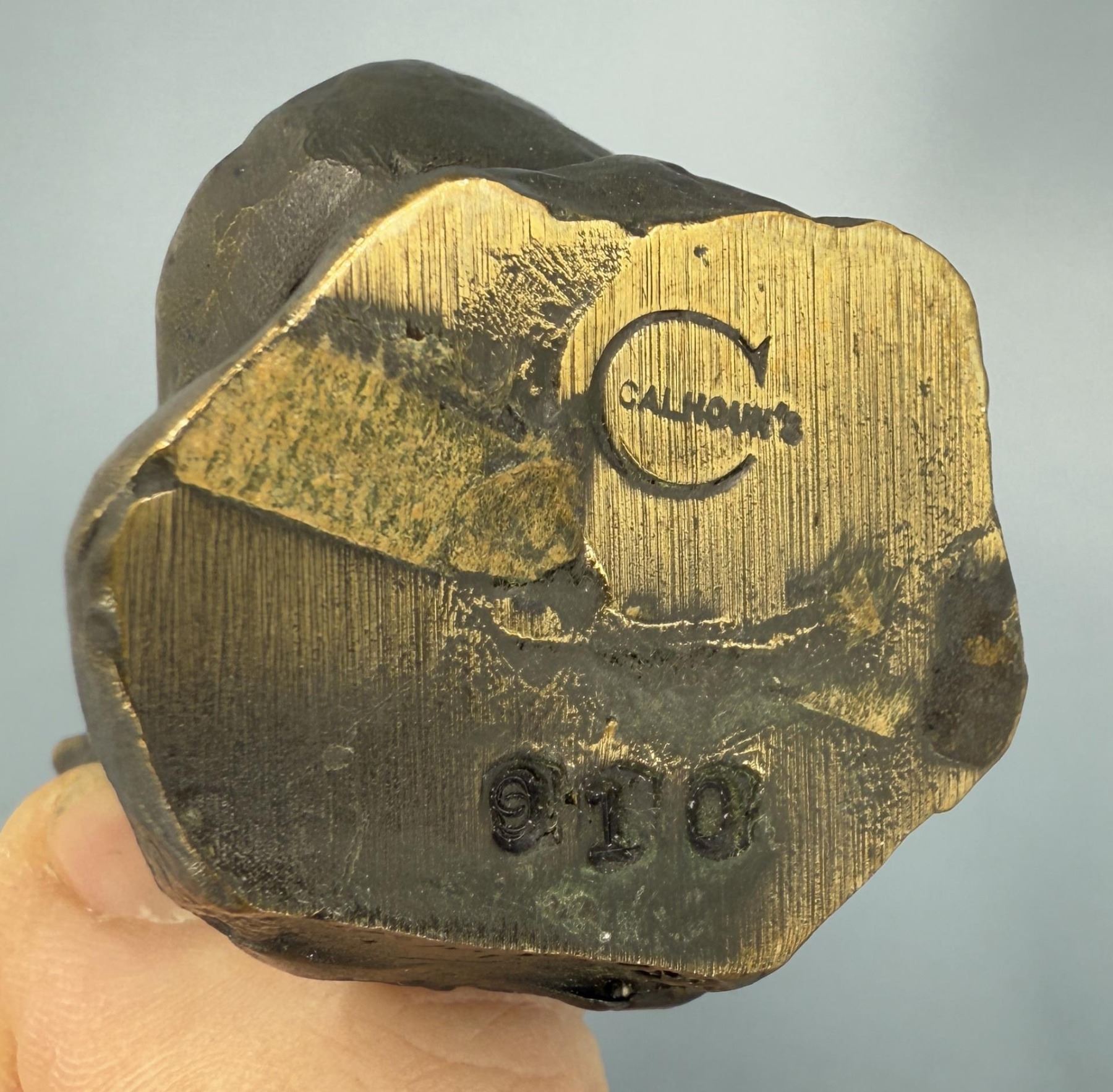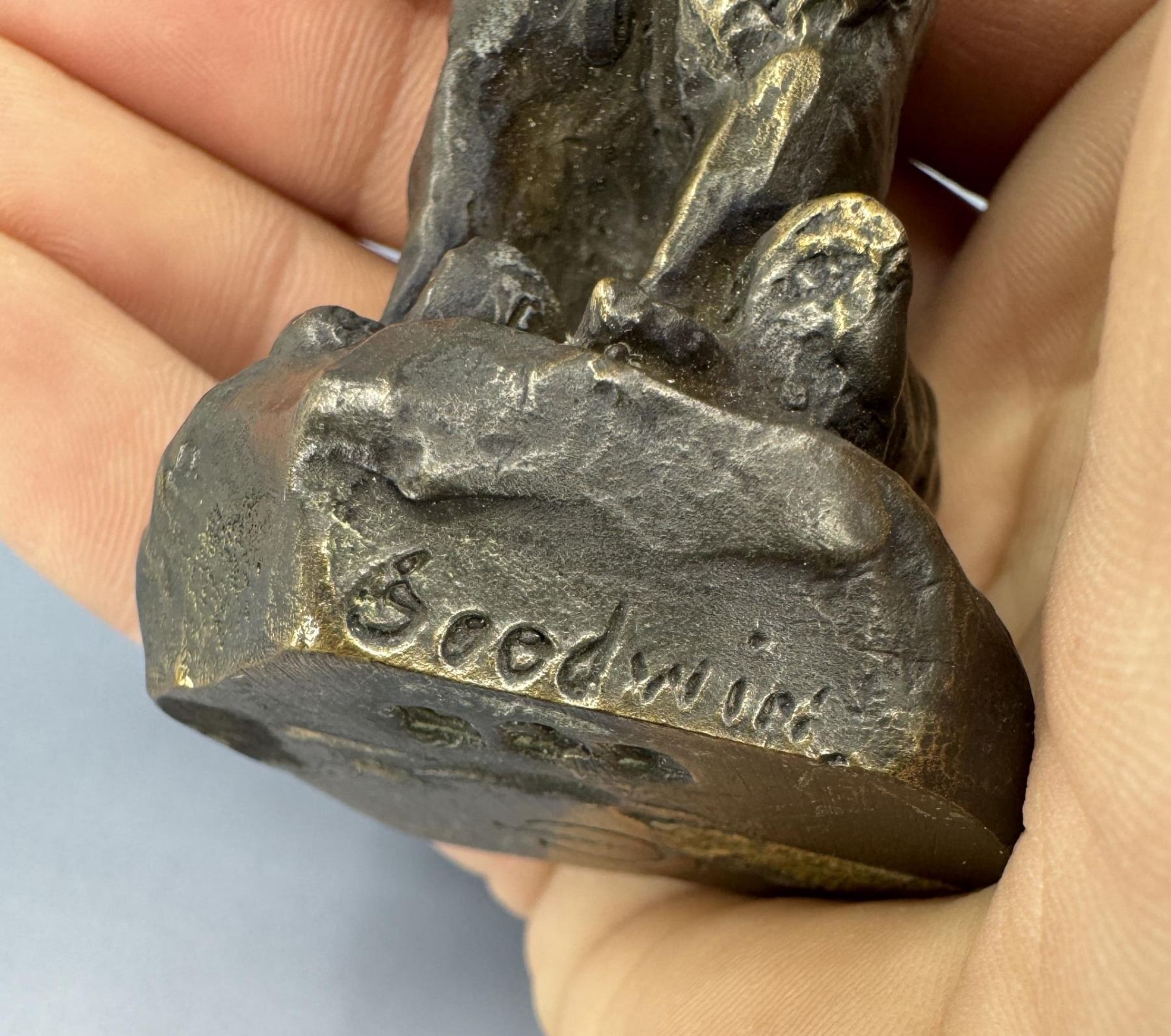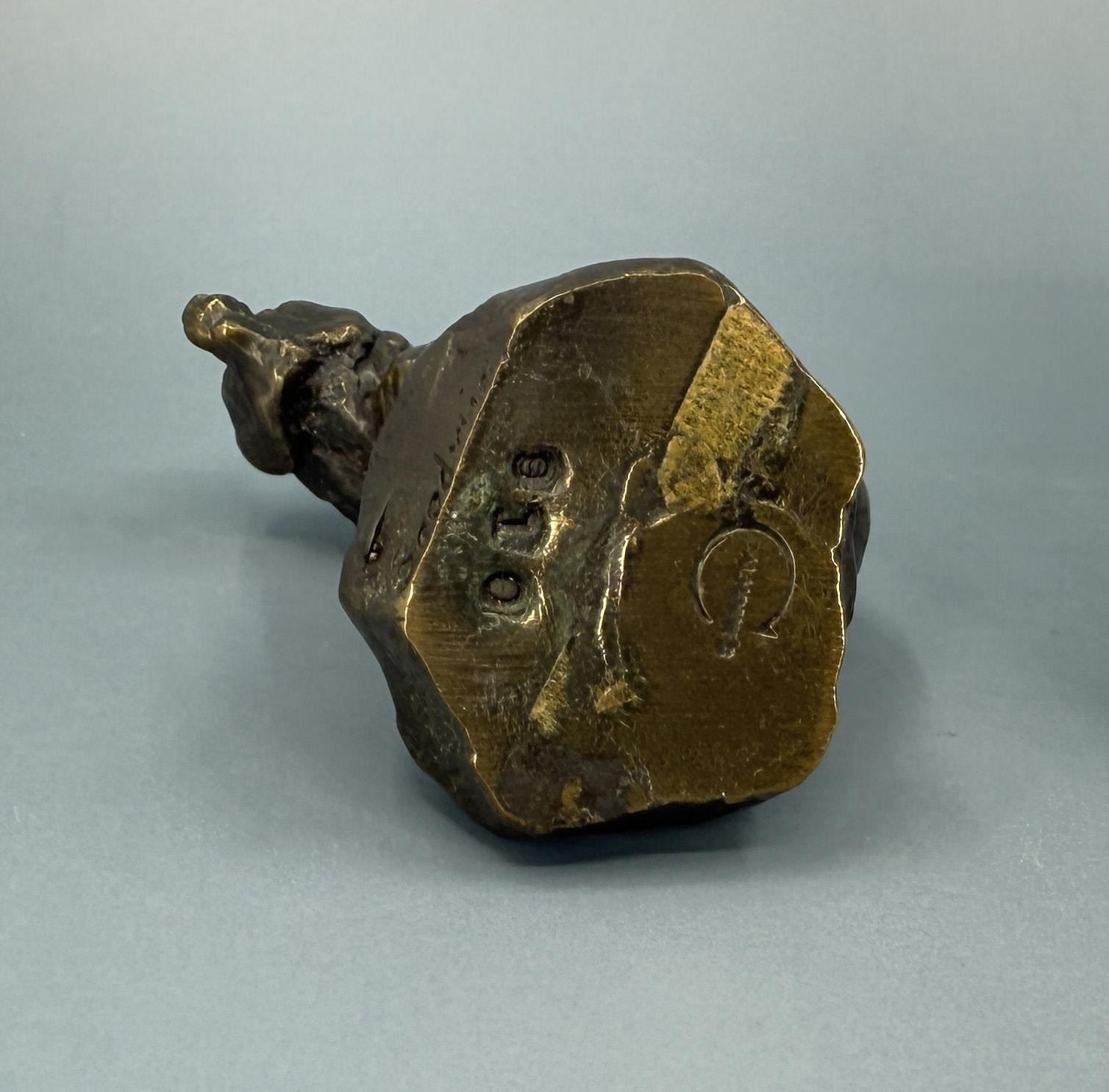 2 3/8" by 2" by 1 3/4". Philip Russell Goodwin (1881 - 1935) was active/lived in New York, Connecticut. Philip Goodwin is known for Animal, field-stream illustration. Known for his illustrations of hunting, fishing, and cowboy scenes, especially scenes featuring firearms, Philip R. Goodwin was from Norwich, Connecticut. By the age of eleven, he had already sold his first illustrations to Collier's magazine. He was educated at the Rhode Island School of Design in Providence and the Art Students' League in New York. He also studied with Howard Pyle in Pennsylvania. His works exhibit much of Pyle's earnestness and discipline, but are restricted almost entirely to subjects of hunting and fishing. In this limited area, however, he produced many notable pictures, the subject matter always convincing and dramatic in color. In his early twenties, he established a studio in New York and met Charles Russell, whose paintings of western subjects provided a great influence on Goodwin's work in that genre. Goodwin's interest in scenes of cowboys and ranch life is evident in Bronco Buster. The two men traveled together on several occasions, sketching source material for their paintings. Meanwhile, Goodwin appeared in such books as Jack London's Call of the Wild. Goodwin's pictures were also published in Harper's Monthly and Weekly, Outing, Scribner's, and Everybody's magazines, in addition to calendar subjects for Brown & Bigelow, advertising for Winchester Arms and the Marlin Firearms Company. He also illustrated African Game Trails for Theodore Roosevelt. Goodwin's interest in Charles Russell is seen not only in Goodwin's use of bright, vivid colors, but also in the romanticized subject matter, which appears to celebrate the bonding of rider and mount.