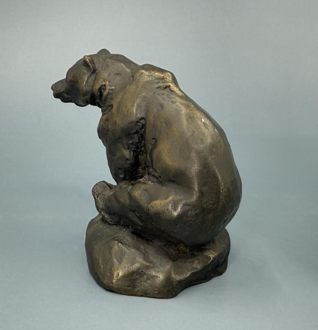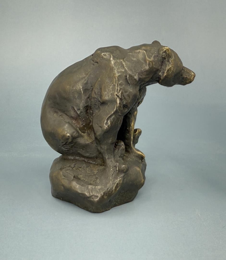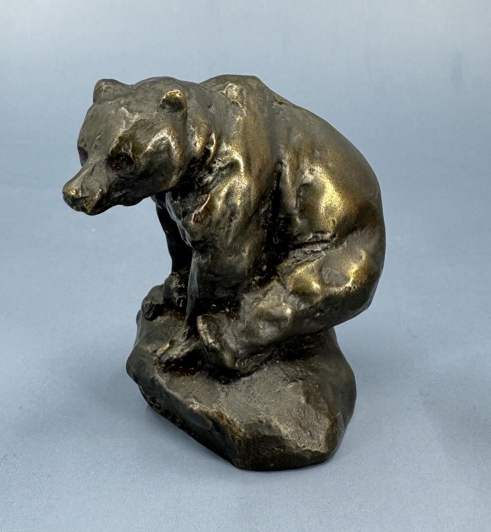 2 3/8" by 2" by 1 3/4". Philip Russell Goodwin (1881 - 1935) was active/lived in New York, Connecticut. Philip Goodwin is known for Animal, field-stream illustration. Known for his illustrations of hunting, fishing, and cowboy scenes, especially scenes featuring firearms, Philip R. Goodwin was from Norwich, Connecticut. By the age of eleven, he had already sold his first illustrations to Collier's magazine. He was educated at the Rhode Island School of Design in Providence and the Art Students' League in New York. He also studied with Howard Pyle in Pennsylvania. His works exhibit much of Pyle's earnestness and discipline, but are restricted almost entirely to subjects of hunting and fishing. In this limited area, however, he produced many notable pictures, the subject matter always convincing and dramatic in color. In his early twenties, he established a studio in New York and met Charles Russell, whose paintings of western subjects provided a great influence on Goodwin's work in that genre. Goodwin's interest in scenes of cowboys and ranch life is evident in Bronco Buster. The two men traveled together on several occasions, sketching source material for their paintings. Meanwhile, Goodwin appeared in such books as Jack London's Call of the Wild. Goodwin's pictures were also published in Harper's Monthly and Weekly, Outing, Scribner's, and Everybody's magazines, in addition to calendar subjects for Brown & Bigelow, advertising for Winchester Arms and the Marlin Firearms Company. He also illustrated African Game Trails for Theodore Roosevelt. Goodwin's interest in Charles Russell is seen not only in Goodwin's use of bright, vivid colors, but also in the romanticized subject matter, which appears to celebrate the bonding of rider and mount.