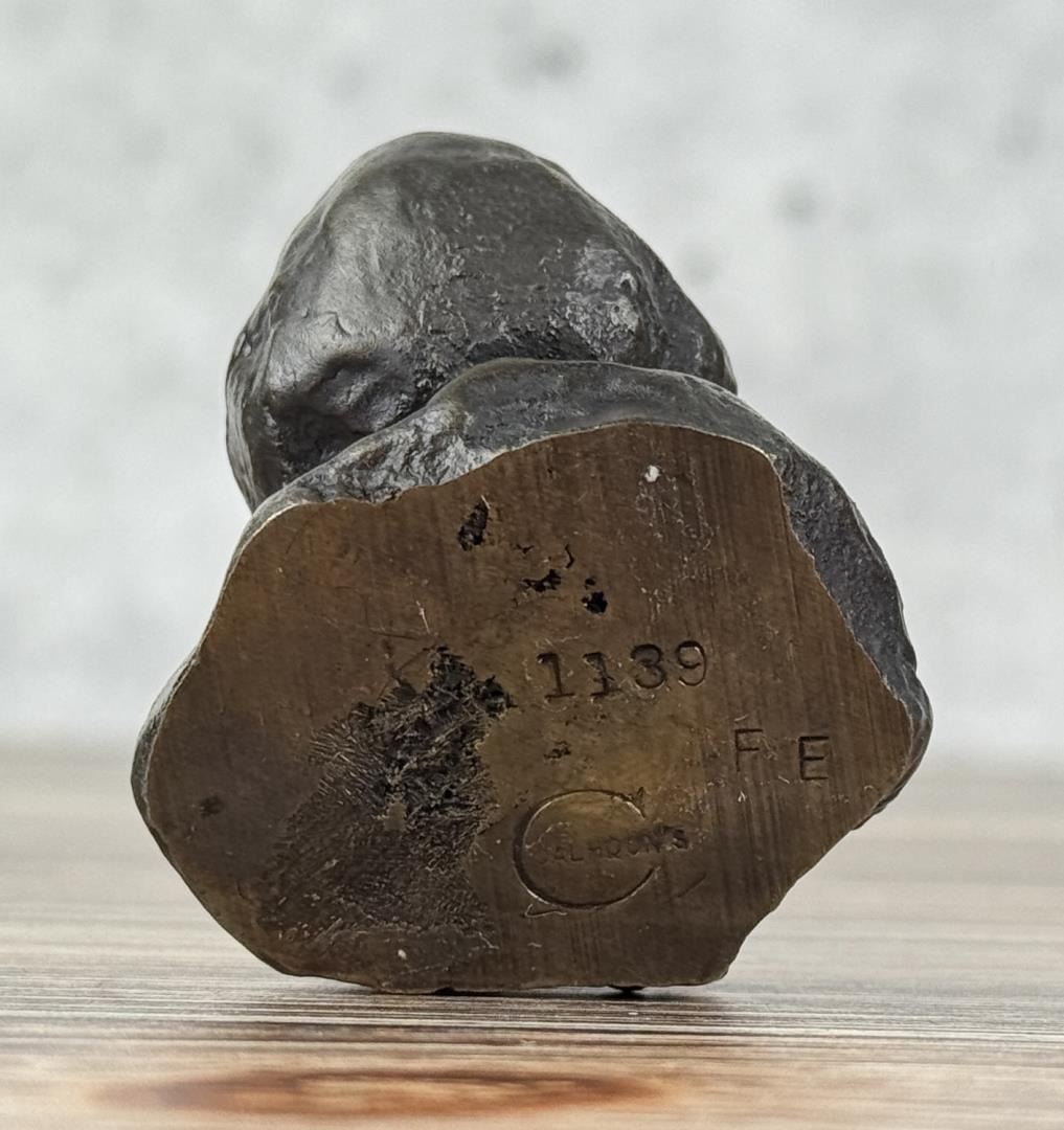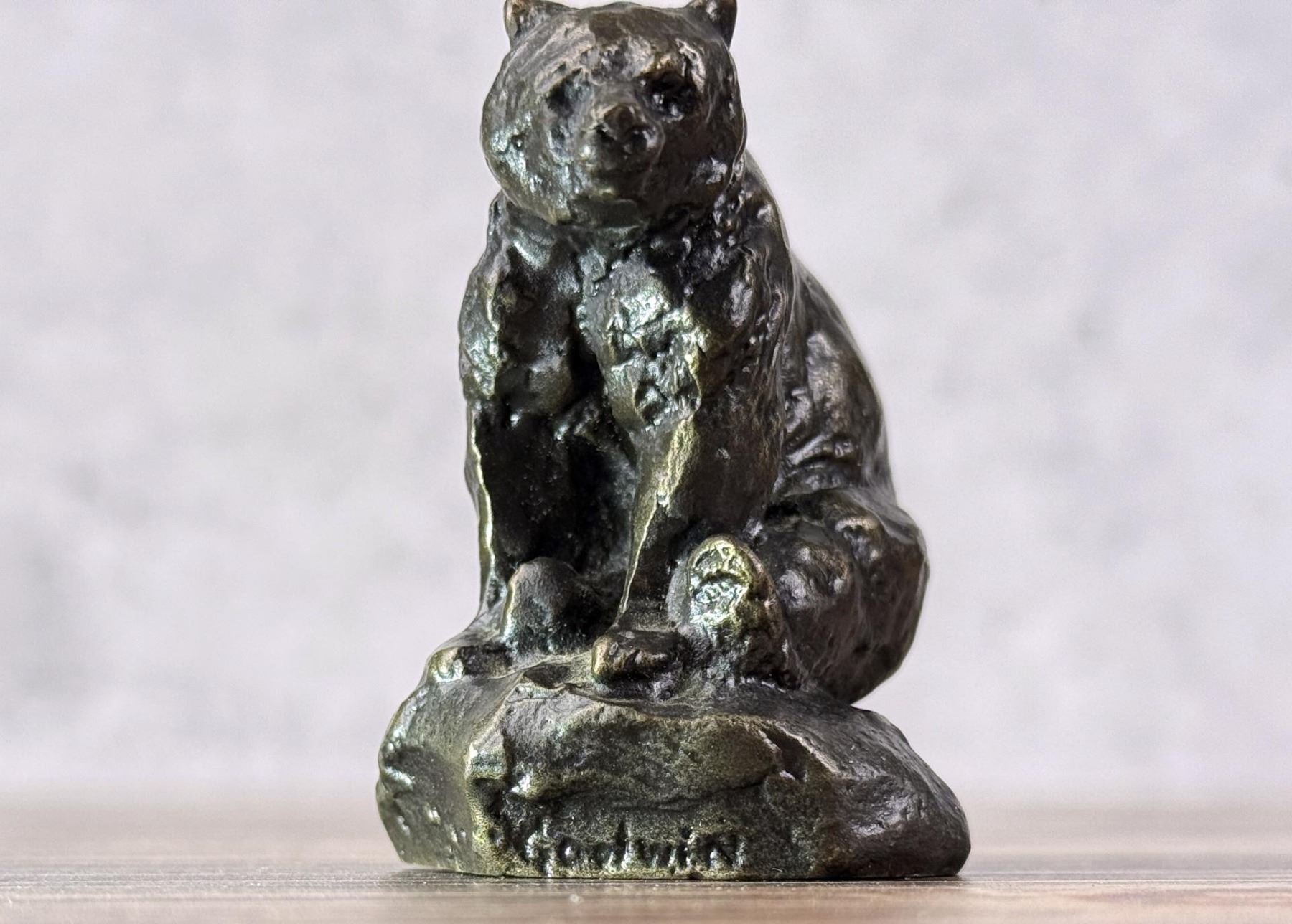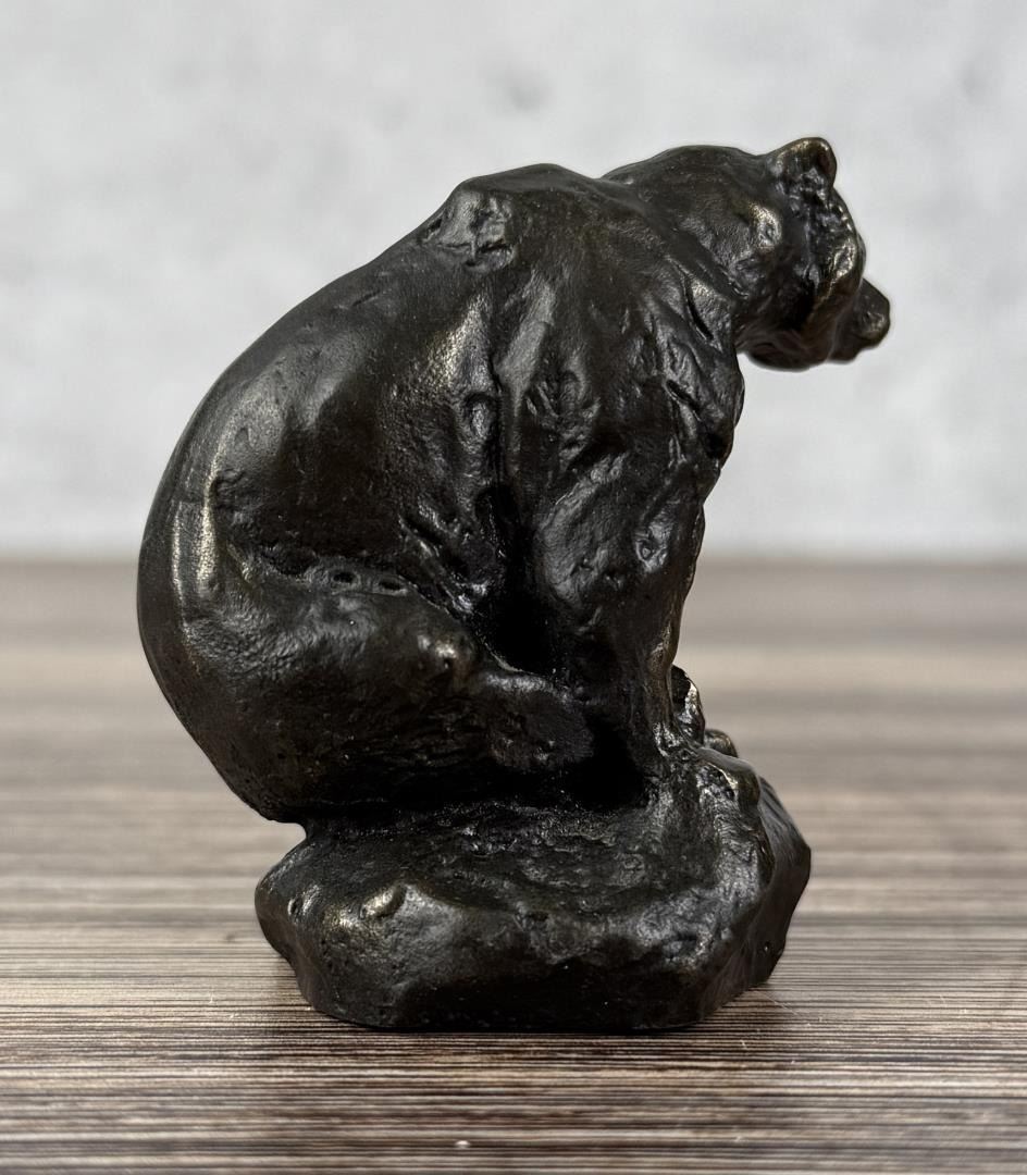 Title is Seated Bear. 2 3/8" by 2" by 1 3/4". Philip Russell Goodwin (1881 - 1935) was active/lived in New York, Connecticut. Philip Goodwin is known for Animal, field-stream illustration. Known for his illustrations of hunting, fishing, and cowboy scenes, especially scenes featuring firearms, Philip R. Goodwin was from Norwich, Connecticut. By the age of eleven, he had already sold his first illustrations to Collier's magazine. He was educated at the Rhode Island School of Design in Providence and the Art Students' League in New York. He also studied with Howard Pyle in Pennsylvania. His works exhibit much of Pyle's earnestness and discipline, but are restricted almost entirely to subjects of hunting and fishing. In this limited area, however, he produced many notable pictures, the subject matter always convincing and dramatic in color. In his early twenties, he established a studio in New York and met Charles Russell, whose paintings of western subjects provided a great influence on Goodwin's work in that genre. Goodwin's interest in scenes of cowboys and ranch life is evident in Bronco Buster. The two men traveled together on several occasions, sketching source material for their paintings. Meanwhile, Goodwin appeared in such books as Jack London's Call of the Wild. Goodwin's pictures were also published in Harper's Monthly and Weekly, Outing, Scribner's, and Everybody's magazines, in addition to calendar subjects for Brown & Bigelow, advertising for Winchester Arms and the Marlin Firearms Company. He also illustrated African Game Trails for Theodore Roosevelt. Goodwin's interest in Charles Russell is seen not only in Goodwin's use of bright, vivid colors, but also in the romanticized subject matter, which appears to celebrate the bonding of rider and mount.