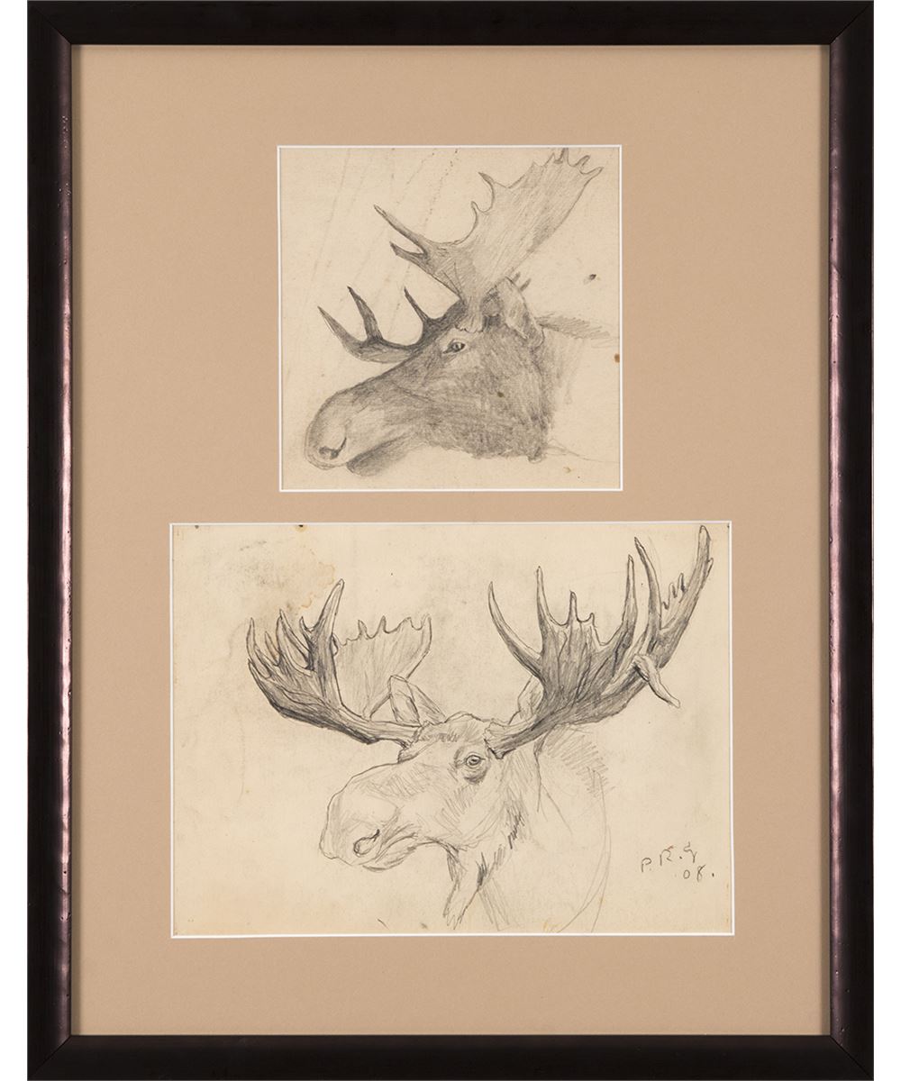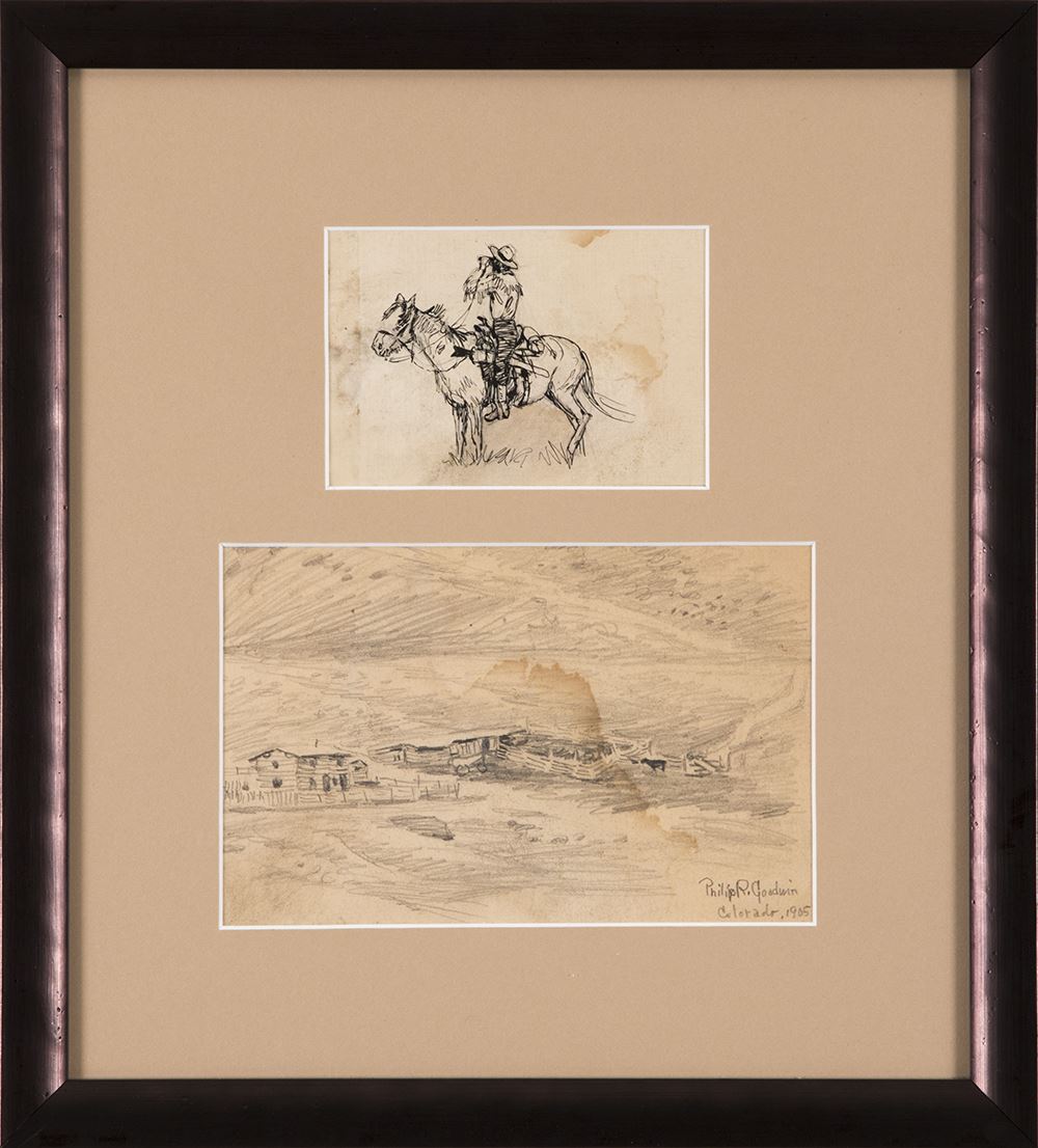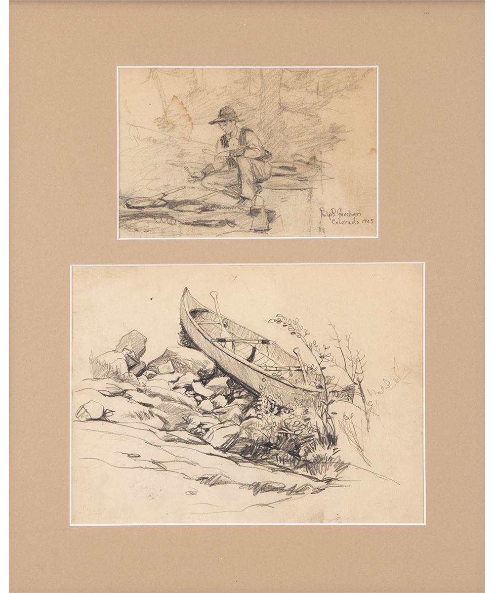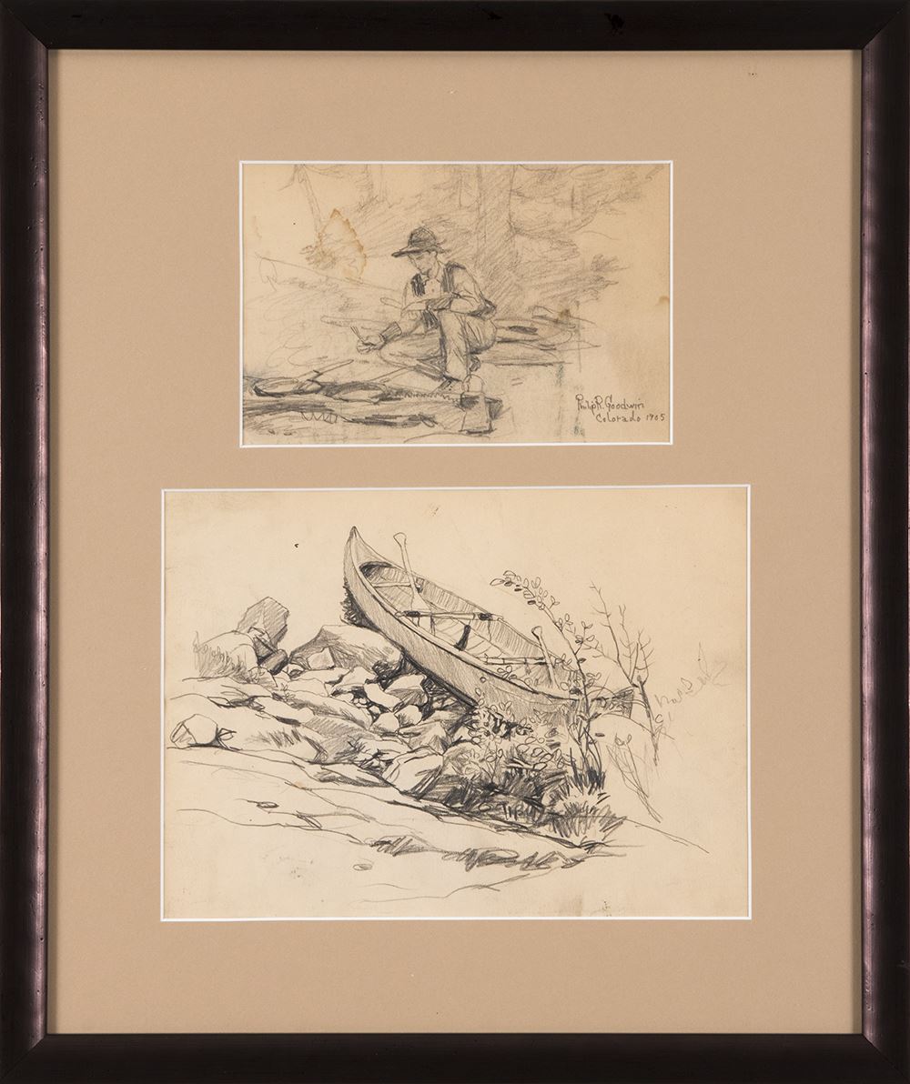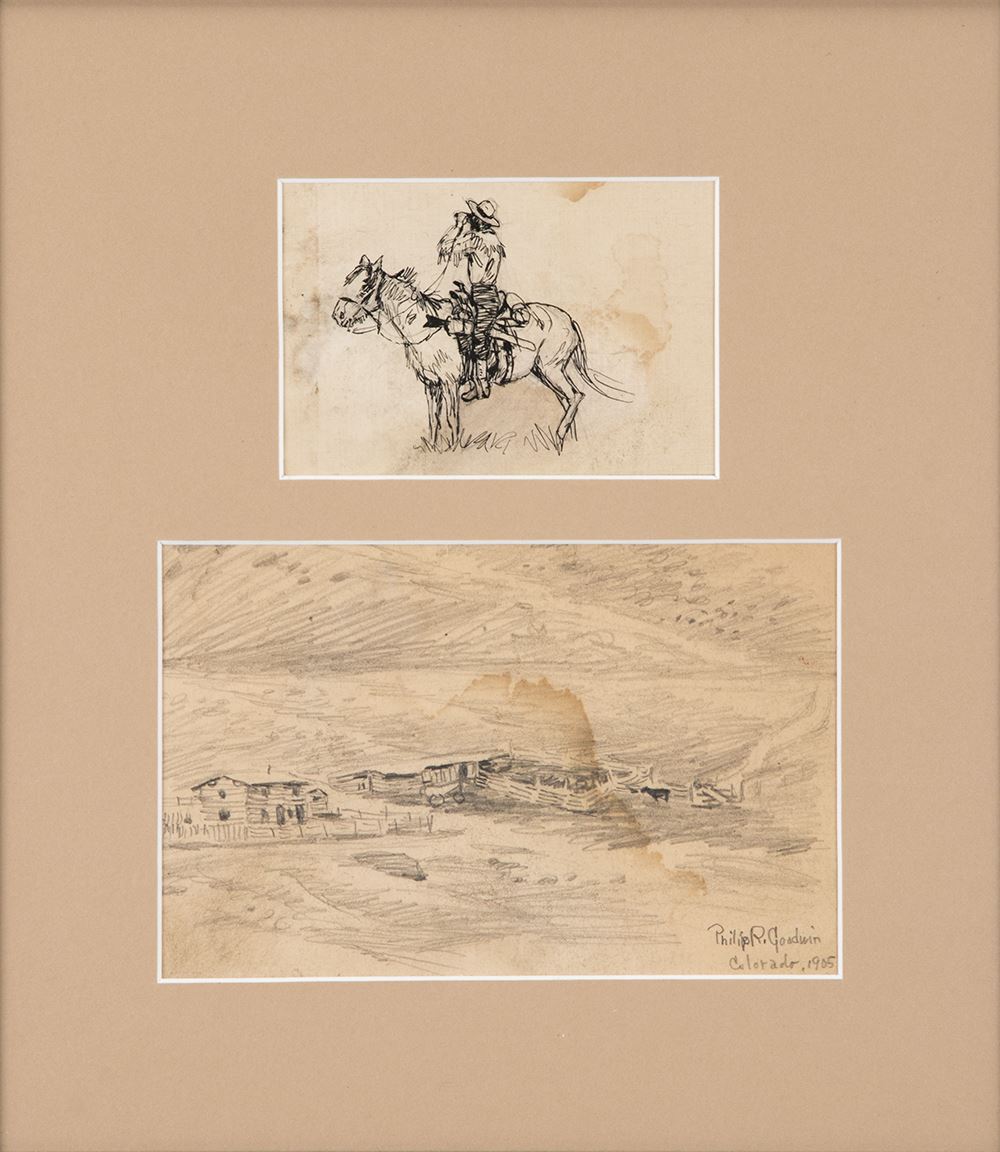 1) Two drawings matted together. A) 3" x 4.5" ink sketch, unsigned. B) 4.5" x 7" pencil drawing, signed and dated 1905 lower right. 2) Two drawings matted together