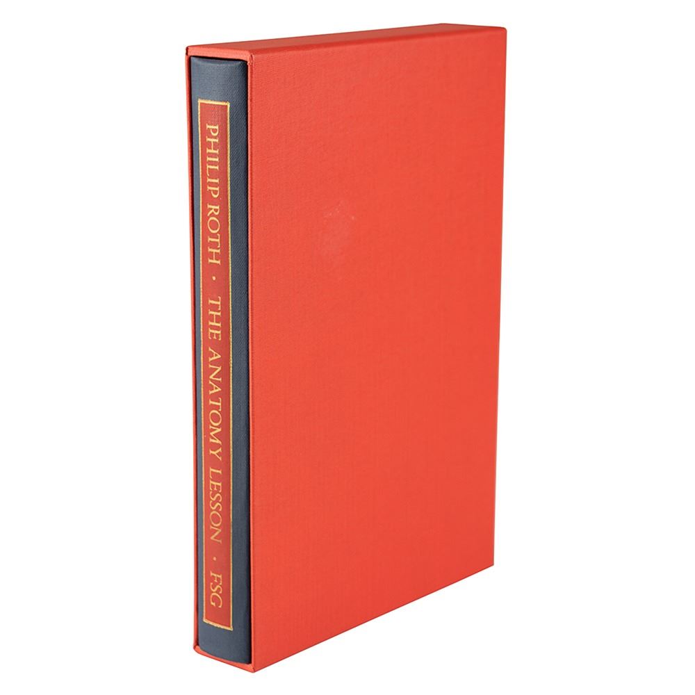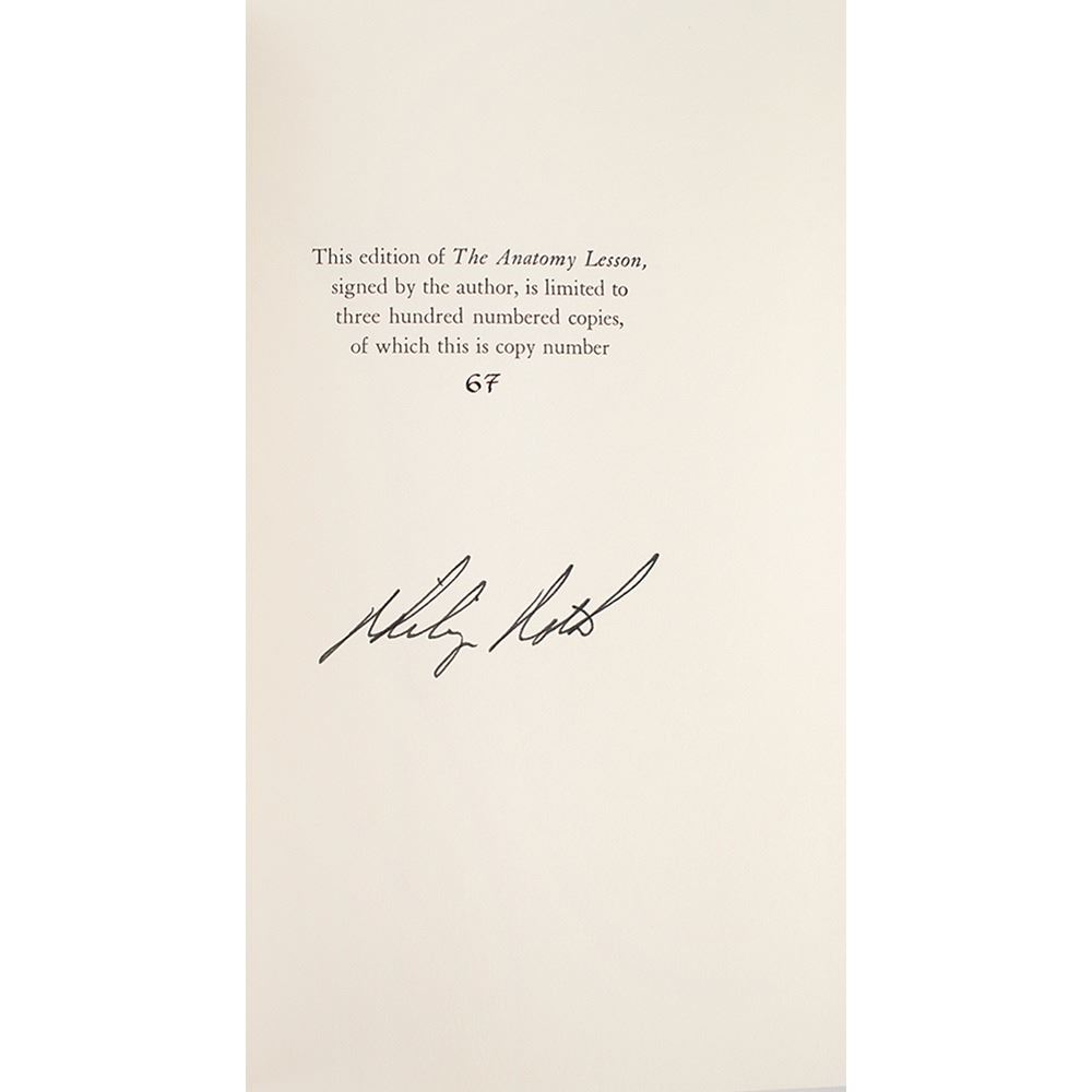 Signed book: The Anatomy Lesson. First edition, limited issue, numbered 67/300. NY: Farrar, Straus and Giroux, 1983. Hardcover with slipcase, 5.75 x 8.25, 291 pages. Signed on the colophon in black felt tip by Philip Roth. In very fine condition.