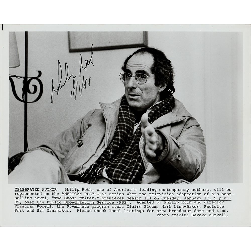 Glossy 10 x 8 publicity photo of the award-winning author for the PBS series American Playhouse, signed in black ink, "Philip Roth, 11/1/88." In fine condition.