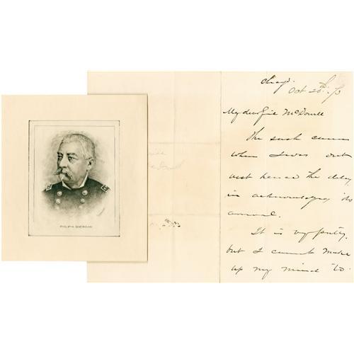 <B>Philip Sheridan Autograph Letter Signed</B></I> "<I>P. H. Sheridan.</B></I>" Three pages, 5" x 8", Chicago, October 20, 1873, to Irvin McDowell. From one Civil War general to another, in part: "<I>...The sash came when I was out west hence the delay in acknowledging its arrival. It is very pretty but I cannot make up my mind to fully like it. It seems to be a little too broad don't you think so. Then it looks a little oddfellowish...</B></I>" Fine condition; mailing folds. Also included is an engraved portrait of Sheridan.