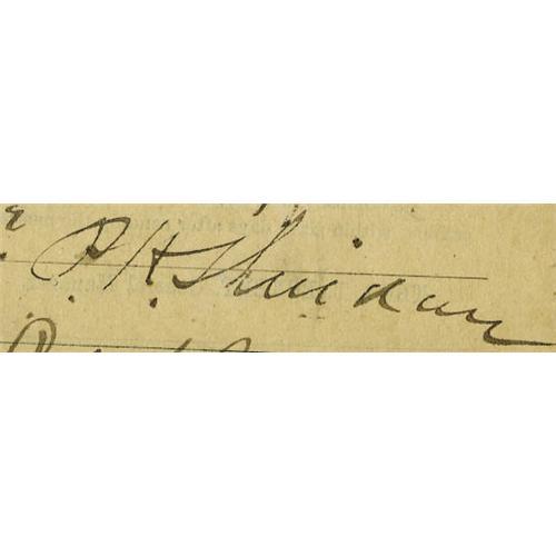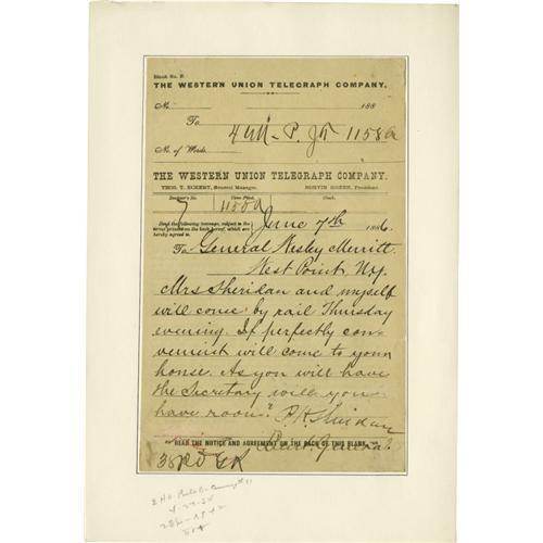 <B>Philip Sheridan Collection.</B></I> This lot features three items written and signed by Philip Sheridan, the great Union Army general and architect behind the protection and development of Yellowstone National Park. <BR><BR>Autograph Letter Signed "<I>P.H. Sheridan.</B></I>" Four pages, 5" x 6.5", Chicago, April 9, 1881. The content of this letter is routine. <BR><BR>Autograph Letter Signed "<I>P.H. Sheridan.</B></I>" Two pages, 5" x 6.5", Chicago, July 18, 1882. The content of this letter is routine. <BR><BR>Autograph Document Signed "<I>P.H. Sheridan.</B></I>" One page, 5.4" x 8", Western Union Telegraph Company Letterhead, np, June 7, 1886. This telegraph was sent to a General Wesley Merritt, announcing that he and his wife would be visiting soon. <BR><BR>The three items in this lot are all in very fine condition; the letters have slight staining around the edges; otherwise excellent! From the Henry E. Luhrs Collection. Accompanied by LOA from PSA/DNA. <BR><BR><B>Important notice