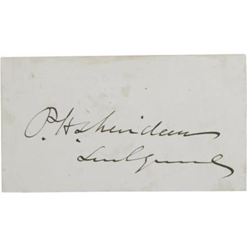 <B>Union General Philip Sheridan Signature</B></I> on a card with rank, "<I>Lieut Genl</B></I>", measuring 4.5" x 2.5". Card has mounting remnants on verso, with some soiling, otherwise good. With a decorative mount bearing a brief biography and a commemorative stamp honoring Sheridan alongside U.S. Grant and William T. Sherman.<BR><BR><b>Shipping:</b> Flat Material, Small (<a target="_blank" href="http://www.heritageauctions.com/common/shipping.php">view shipping information</a>\)