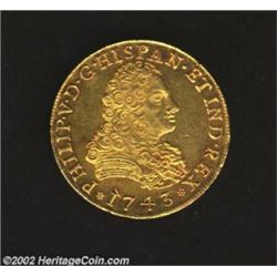Philip V Gold 8 Escudos 1743MF, KM148, Virtually UNC with superb details and full mint brilliance. Just a beautiful example of the artistry of the colonial series.Ex: Ponterio August 18/19, 1989, lot 1675. From the Hans A. Land Collection. Important notice: We expect to be auctioning lots at the rate of 200-250 per hour. Sometimes eBay Premier live bid software cannot keep up with that pace, so we strongly recommend that you place a realistic proxy bid now as insurance to avoid disappointment. Also please note that all Heritage/CAA lots purchased through eBay Premier carry a 20% Buyer's Premium. Please make sure you read the Terms and Conditions.