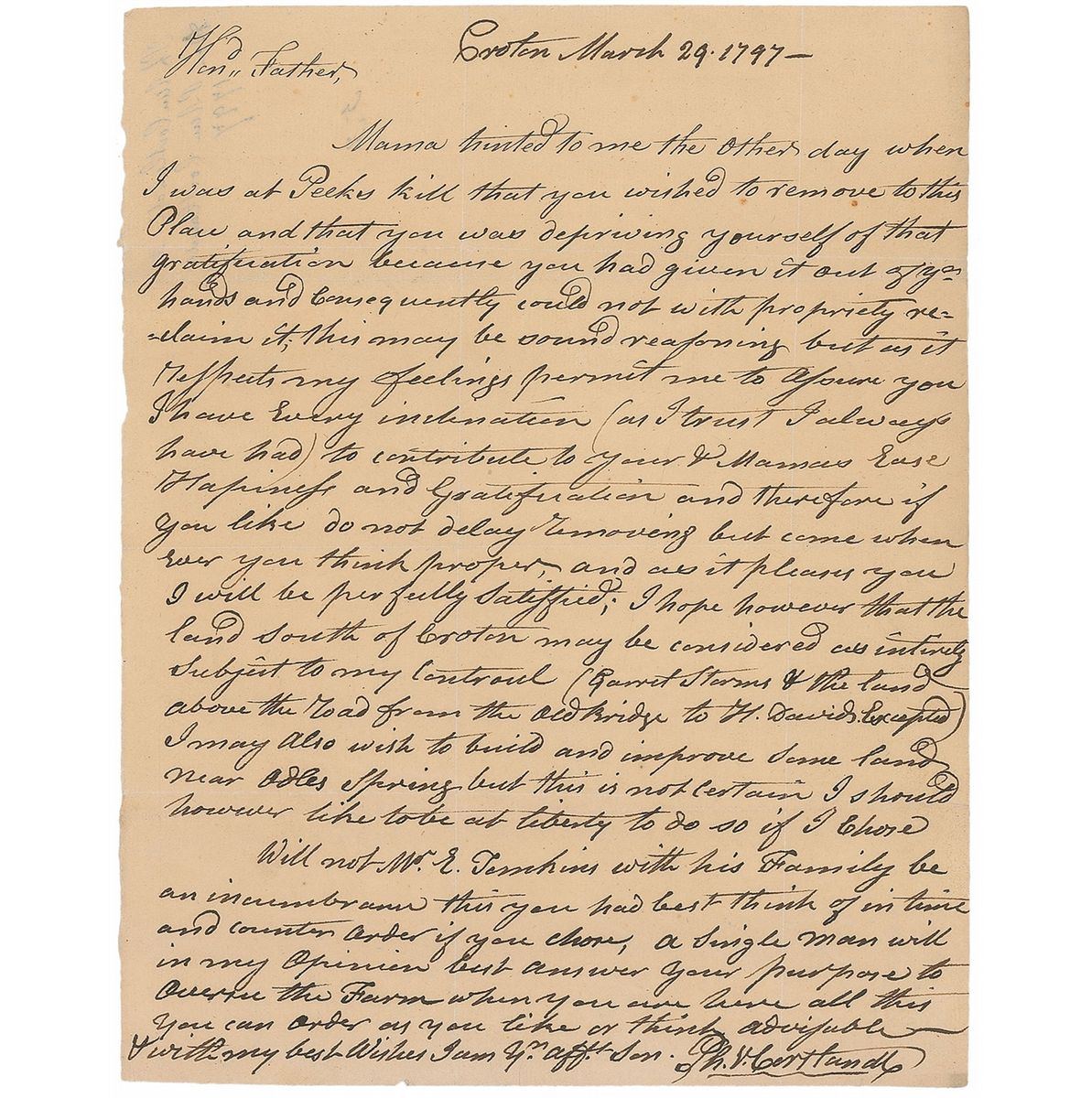 Colonial officer during the Revolutionary War who fought at the Battle of Saratoga, was with the Army at Valley Forge, and took part in the Sullivan Expedition (1749–1831). Boldly penned ALS signed “Ph. V. Cortlandt,” one page, 7.75 x 10, March 29, 1797. Letter to his father. In part (spelling and grammar retained): “Mama hinted to me the other day when I was at Peekskill that you wished to remove to this place and that you was depriving yourself of that gratification because you had given it out of your hands…this may be sound reasoning but as it respects my feelings permit me to assure you I have every inclination…to contribute to your & Mamas Ease Happiness and Gratification and therefore if you like do not delay in removing but come when ever you think proper.” In fine condition.