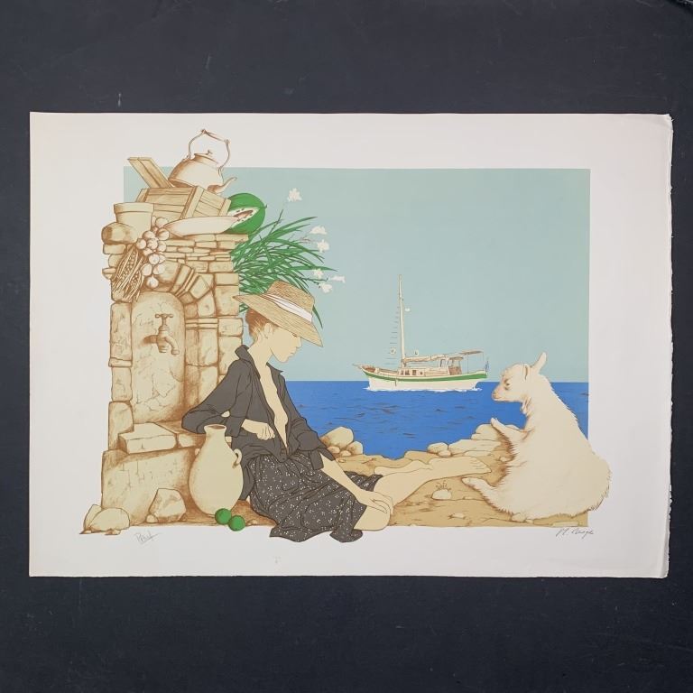 Philipe Henri Noyer's "Girl by the Ocean with a Goat" limited edition print, signed lower right and numbered PROOF lower left. This piece is a woman resting by a water foundtain on a boach, with her goat laying beside her. There is a ship off in the distance in the water. This piece is in very good condition with minor wrinkles at left, very minor wrinkles at top, crease upper right corner, very light crease lower right corner, frilled edge at right.