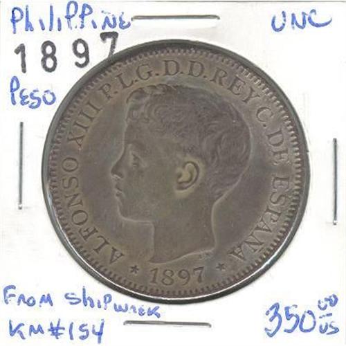 Philipine 1 Peso 1897, grade UNC, KM # 154. From shipwreck.